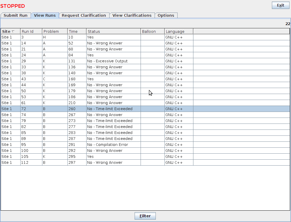 学长的K又交了几次,没过,我跟学长找K的问题。学姐先上去敲B的模板。学姐敲完模板之后,学长上机写B。我把K的题意和算法跟学姐讲了一下,没找到问题。期间B题提交不是TLE就是WA。学姐发现K题一个地方可能超int,改了就过了,'''K 210 7Y'''。