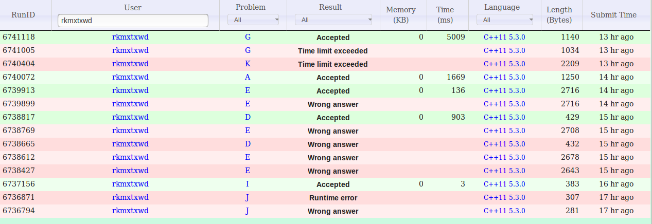交了一发,抢到了RUN ID 1然而并没有什么卵用,果断WA了……问了下之后过I的同学知道是EOF输入,又交了一发RE了,于是疯狂debug但是根本看不出哪里会RE,后来