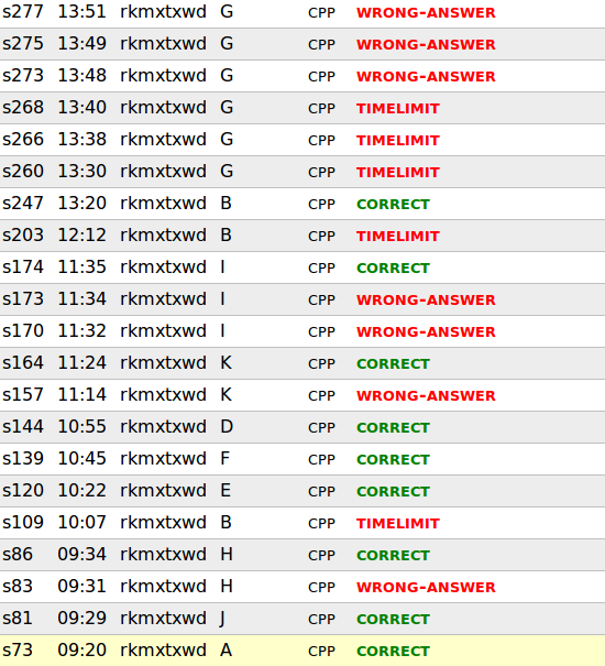 网络流写二分图导致的……除此之外还是码力不足吧,G这个搜索一直没有debug出来,C想法正确但也因为手速较慢,来不及写,还是要学习