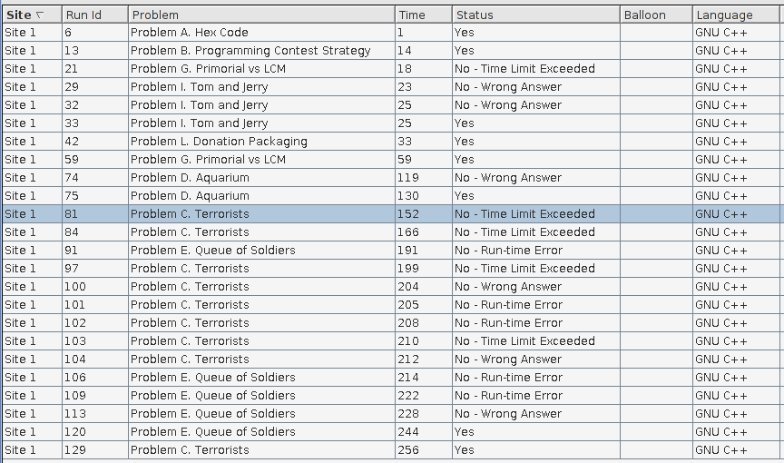 从出题数上来看今天打得还不错,一开始我切了AB两个水题,之后学长们切了两个水题,远学长猜到了I的结论,十分厉害。jcq学长搞过了G题。学长在写的时候我看了C题,观察出了一些性质,感觉可写,学长写完之后我就上机写了,在写C的时候给jcq学长说了一下D题可做,学长很快秒想到了最小生成树,因为按照以往来看我经常会卡在某些地方。。所以学长确认想清楚D题之后我就让给学长写D。事实证明我对自己还是很有数的。。学长很快搞掉了D题,之后主要就是我在调C。。一上来T了就在各种调常数。。但一直过不了。。最后没办法把LCA改成tarjan离线求就过了。。中间还滥交了几次来测试时哪个部分复杂度比较高。。导致最后罚时爆炸。。K题两个学长都推出来了公式但因为情况太多太复杂弃掉了。。最后半个小时一起搞H但因为时间不够没搞完。。