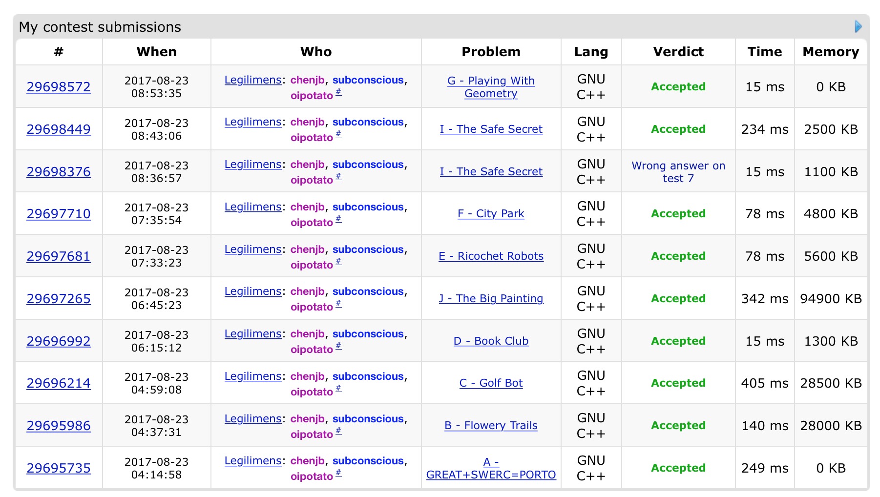 今天我们加训SWERC 2014,快开场时hznu同学出现了,N脸懵逼,最后邀请他们一起参加,后来彪爷也开始单挑. 开始时sub从A开始看,cjb从D开始看,yzc从J开始看,sub发现A是签到题,开始签,此时yzc给cjb讲了J,cjb表示大力哈希稳如狗,于是看其他题,cjb给yzc讲了E,达成了爆搜可以过的共识,不久后A1y14. yzc换下sub写E,sub看了看B,让cjb去写,然后cjb把yzc从椅子上踢下来去写B,B1y37. sub表示C就是个FFT傻逼题,让cjb顺便把板子抄了,然后sub接手写其他,C1y59. cjb又接过电脑去抄板子,抄了个没用上的tarjan和J题的hash,然后yzc和sub讨论出了D题的深搜做法,yzc上机写D,敲完之后被cjb和sub出的数据卡掉了算法,三脸懵逼. 此时让yzc帮cjb写J的读入,然后已经和sub再次确认了J题的cjb接手写J,yzc和sub继续讨论D,得到了网络流(二分图喵喵喵?)的做法,cjb打了个大概之后打印代码,然后敲了dinic的板子,yzc接手继续写D,然后与sub发生了友善的争吵,cjb偷偷抢过电脑继续写J,yzc表示发现自己的错误,改了之后还是没通过样例,sub抢过电脑,迅速改完读入,通过样例提交后D1y135. 三人一起调试J题,后来发现变量名打错,提交后J1y165(幸好在debug的时候sub提出要换哈希值,不然会wa掉). yzc接手写E,sub开始考虑F,中间曾经换过电脑让sub写F,开始纠结stl如何使用,后来下机时cjb给sub讲了他的想法,然后sub猛然惊醒‘GtmSTL!’,继续写F,yzc和sub交替调整代码. 最后yzc先改好,E1y213,sub接手调了一会儿就F1y215. 此时cjb给出了G的错误理解产生的错误做法,撺掇yzc去写,千辛万苦调出样例1,发现样例2不符合理解,陷入绝望. 幸好cjb和sub在yzc孤独写G时想出了I的做法, 让yzc去写,很快写完后wa了本场第一发(也是唯一一发),后来感觉要写高精度,再认真读题发现在long long之内,修改后I2y283. sub此前终于看懂了G的正确题意,迅速给yzc讲了操作后,yzc迅速改了一发,然后一发入魂G1y293. 最后罚时1434,9题,在Codeforces的board里rk4,现场赛中因为罚时输给冠军,rk2,与Summer2015相比,也因为罚时输给了Siunaus(1145)和The Last Episode(1286),rk3.