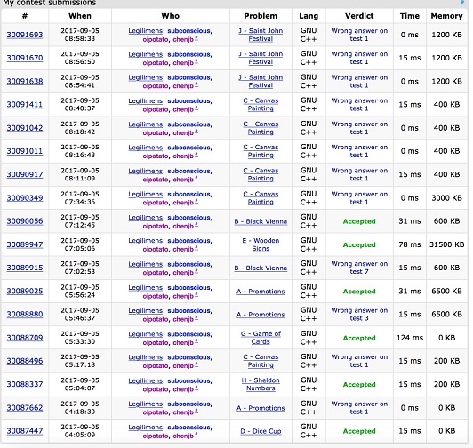 今天cjb和yzc和四队jww加训SWERC2015,开场yzc从A开始看,cjb从J开始看,jww从中间开始看,jww很快发现D是签到题,上机打D,D1y5. yzc认为A是签到题,上机写A,获得wa,然后cjb去签H,结果过不了样例,调不出来很奇怪,浪费了一些时间,挣扎了一会儿,最后换jww重写,重新写时两人发现要去重,然后就加了set然后过了,H1y64. yzc又去写了C,结果还是wa. cjb想出了博弈题G,上机写G,G1y93. 这段时间jww和yzc想好了A的bitset做法和B的2-sat,yzc上机写A,A2y116. yzc上机B,cjb和jww讨论E和C,认为C这么多人过一定是最明显的贪心. yzc的2-sat挣扎了很久,不时被jww换下写E,然后cjb有时也上去写C.180分钟的时候yzc过了样例,然后wa了一发,打印代码,jww最后E1y185,yzc找到了bug,B2y192. cjb继续完善C,结果最后还是wa,cjb怀疑人生,和yzc讨论C,jww上机写J,C和J都没做出来,最后rk 50.