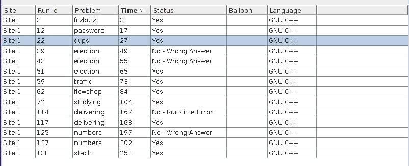 开场yzc说他能看懂A,于是cjb从B开始看,然后yzc上机打A,交了之后'''A1y3'''。这个时候我把B题给看完了,给yzc讲,表示可能会有一点精度问题,yzc上机打B,cjb看完了C发现也是个类似的题目,但感觉容易写一点,打断yzc给他讲了C,他犹豫了一下先去写C,期间cjb看完了D和E,'''C1y17'''。这个时候看榜发现有人过I,cjb去看I,yzc继续打B,发现I是傻逼题就打断了yzc并让他敲了一发I,'''I1y27'''。发现一队和hznu过了B,判断精度不会炸,yzc瞎交了一发喜获wa,然后发现想错了,又迅速改了一发继续wa,打印下来看程序的时候发现非常脑残地写错了组合数,'''B3y65'''.期间cjb又看完了F、H、J,让yzc去写F的模拟,'''F1y73'''。因为H和J不太会,所以挣扎地看完了G,发现依然是个傻逼题,然后和yzc讲了之后直接去写G,'''G1y84'''。这时候cjb先上机把D题的读入和最短路敲完。yzc在想E,因为大家纷纷过了E有点烦躁,yzc提出了一个将小数强行微分到整数块然后乱搞的做法,获得认可,yzc写了一发'''E1y104'''。这个时候剩下D、H、J,发现都有人过,思考了一会儿决定刚D,cjb上机把最短路图建出来之后,yzc提出网络流,犹豫了一会儿直接上二分图匹配,浙大板子实在不靠谱,cjb靠着自己的童年记忆强行匈牙利,在yzc帮助下调过样例,交一发喜获wa,检查代码发现边开少了,改完之后又看了一遍,'''D3y168'''. H题的贪心和构造比较显然,但细节有点多,讨论了之后决定强上贪心,直接从2、4、8补上去,交一发wa,手出数据发现没处理特殊情况,特判之后'''H2y202'''. 最后时刻挣扎搞J,cjb提出强行区间dp F[i,j],yzc上机写了之后发现第三个样例过不去,努力挣扎了一会儿,发现需要把栈顶加入转移,最后过了样例交了之后'''J1y251'''. 于是就AK了呢,一队在229的时候就AK了,虽然我们比一队少wa了2发,但依然排在第二。