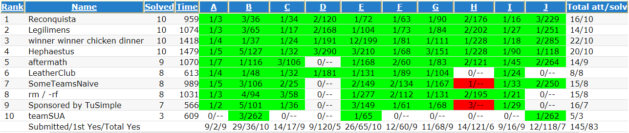 | Rank | Name | Solved | Time | A | B | C | D | E | F | G | H | I | J | Total att/solv |