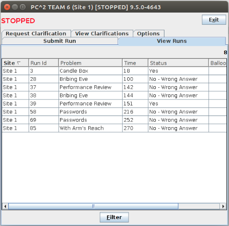 可以看到,我们队就只在前2h过了两道题,然后就再也没能过其他的.最大的失误就是在策略上,比赛后期甚至达到了四开.就是本来有两道题卡住了,之后决定放弃,又另外开了两道,后来又觉得之前的程序调一调就能过,然后三个小时基本上就全这样荒废了.最后还有1h才又看榜,发现最后一题可做,但前一个人还在写,等到真正上去做题又过了30min,最后刚过编译就提交,刚选完代码没来得及提交就STOPPED了(这样的代码就算交了应该也没法ac).
