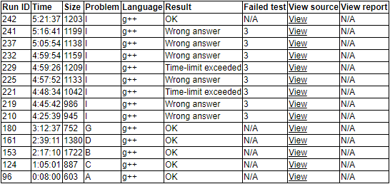 流水账:今天开场我从后往前看(jtjl(惊天巨佬)学长在赛后跟我们说了一个似乎没什么用的知识:日本比赛难度一般从前往后递增),于是看到了题面很短的J题就非常想要做掉这题(由于没有意识到这是个凸多边形,于是也没有想到三分套三分的做法,而是打算在大家没题做了的时候模拟退火),掏出了板子跃跃欲试。wyz平稳地在开场8分钟的时候签掉了A题('''A1y8'''),换上了chy学长来敲B题。wyz给我讲了C的题意之后,我提出能不能排序一把,从左往右直接扫过来,被驳回了,虽然不知道为什么被驳回,但是我开始了奇怪的思考,给出了一个奇妙的树状数组的做法,然后chy的B题貌似出错了,不解,wyz想到了一个C的做法:从左往右扫一遍(我发现之前我们的交流也许出现了不明差错)。于是wyz就上去敲C题了,chy则过来和我讨论B题,表示他读题也许有问题,样例的理解都似乎不太对,在苦思冥想之后,我们同时发现他题意中的相邻交换看错了。随后wyz平稳地过掉了C题('''C1y65'''),chy继续调了一会儿B题,我则和wyz一起想D题,我一看D题,就表示哈希吧,wyz觉得不太会,我也觉得不太稳,就随手给出了另一个带log的做法,表示可能不太行,wyz指着20s的时限斥责了我之后我表示醍醐灌顶。于是让wyz和chy交替写题(可能和chy发现题意错误的时间在这里,记不清楚了),但是随着B和D双双debug不能,时间很快就到了两个小时多,中间我看了G题和H题,觉得G题就是个很简单的二进制小数模拟,随后很快想到了要记录小数点后连续1的个数,推出了一个直接输出Yes的结论,觉得问题很简单,打算如果两人B和D调不出来就先写G稳稳地过题。在这样的威胁之下,两人的B题和D题果然马上就解决了,平稳提交,双双1A('''B1y137''')('''D1y159'''),让wyz赶紧敲G题,我在旁边提醒细节,同时想一下H题,chy先看H题再看I题。其后在还过得去的时间里过掉了G题('''G1y192'''),其后,大家觉得H题和I题可以一做,在一段时间的各自找题思考之后,chy提出I题看起来像是个贪心,给出了几个例子,觉得面积最小为宽度,在大家觉得似乎没什么错的情况下让chy去写题了,但是chy一坐到位子上,我突然意识到不对,提出应该找和对角线最近的点来构成三角形,并且因为我觉得是数论题,我就往数论的方向想了,给出了一个式子:ceil(Bx/A)-Bx/A,要令这个式子最小,于是很快就决定先除gcd然后求解线性同余方程,顺手掏出了板子。过了一段时间,I题总算敲好了,然后在样例上调试了很久,交了上去却返回了WA。于是开始了瞎改模式,一直到最后十多分钟的时候才意识到也许有凹四边形的解(一开始我提出来并自我否决掉了(一口大锅自己背到了背上)),chy打算random一波,我制止了他并尝试了一种四边形(三个点已经是正解了?),没有时间想到取对角线上的最小整数点,让chy交了两发随机,就结束掉了这场比赛。在赛后21分钟我终于把I题过掉了。