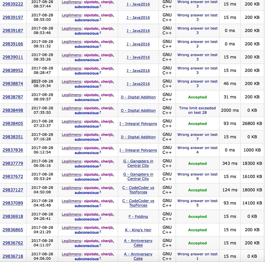 今天我们其实应该能够做出J甚至B的,但我们中期两道题卡了很久,导致我们队研究两道构造题的时间都不充裕了,J题没有过实在是太可惜了..今天我们要总结一个非常重要的调整地方:我们之前一直认为这道题谁写得快就谁写,但实际上,对于比赛中期的题目,我们三个人都能写,就算慢个十几分钟才能写完,其实也微不足道. 我们之前已经对各自要努力的方向有了分工,但其实这个最应该体现在对于一道X类型的题目,应该让平时偏向X类型的同学主导讨论,而谁来写这道题则不一定,除了考虑上机时间,更要考虑在上机写这题的时间,机下的两个人能否针对剩余的题目进行比较高效的讨论,今天yzc一直在写代码,但实际上构造题比起cjb,yzc更适合去和sub讨论,而cjb写出G还有I是不存在任何问题的,即使比起yzc可能稍慢,但也不会差很多,而且这样实际上为两道构造题赢得了非常多的更加有效的讨论时间,所以以后上机的选择,除了考虑上机时间,还要考虑一下机下的讨论,选择一个比较科学的人选上机是保证效率的关键,而这样,我们读题时写的list也能更加有效地利用起来.