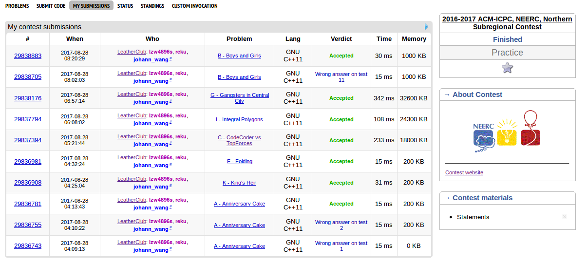 A题一看是个签到题,很激动,想着要比二队先过这个题,写好之后马上交了,结果贡献了罚时。以后比赛中不应该出现这种心态,签到题还是要求稳,不差那么一两分钟来检查一遍。 G题很快就想到了线段树维护LCA的两个log的做法,但是比较手残,写好之后调试了二十多分钟,如果能把这些时间节省下来,让Johann去写D题,说不定还可以多过一个题。 另外今天的I题和Johann学长讨论出解法之后,我自己想的实现方式和Johann学长上机写的方式有些不一样,看了Johann学长的代码以为是错的,讨论了一会儿才弄明白,也耽误了一些时间,队员之间的配合上还有待提高。