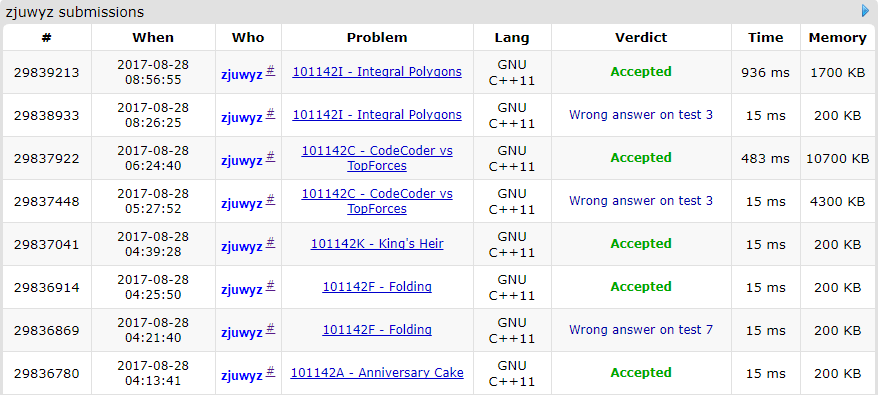 流水账:昨天没睡,恍恍惚惚地来到机房,大家一起打开题目来看,很快签掉了A题('''A1y8'''),然后wyz表示看到F是个水题,上去敲,WA了一发之后我找到了一个错,改改之后平稳过题('''F2y20''')。其间我和chy讲了K题表示很水,于是chy在F题AC了之后就上去敲K题了,也平稳地AC了('''K1y34'''),在这中间,我和wyz讲了错误的C题题意,wyz觉得很有道理,并且我还顺便给出了一个树状数组的做法,数据范围很契合,让wyz上去敲,花了约一个小时终于敲好,交上去却是WA,然后wyz发现我读错了题,我认怂,并且马上扔出去一个正解,让wyz上去敲。于是又经过了约一个小时,才A掉了C题('''C2y139''')。这锅我背定了。然后大家沉浸在I题、G题、J题的思考中,I题我提出了可以试一下按顺序用点转移状态之后(我)放弃了,wyz想出了正解,我觉得很可行,反正机子空着,就让他上去码了。我则和chy讨论了G题,我大致提出了用根结点分子树,用序列维护叶子的方法,chy则提出可以通过记录最左边和最右边的结点来优化复杂度,但是似乎有什么不对,我表示可以用set做,于是G题的正解就出来了,但是我们的机子要用来写I题,此时G题可能也来不及了。至于J题,我嘟哝了二进制的做法,表示就差凑个1出来,wyz则想到了凑1的方法,但是之后做法不知道,然而不知出于什么原因,两人的想法居然没有互相接收到,错失了A掉J题的机会。在WA了一发J题之后三人开始debug,我左思右想觉得没问题之后,重新读了一遍题目,知道今天我的锅可能不止一口了。我擅自加了个初始面积为整数的条件。在最后十余分钟督促wyz改掉之后成功地AC了I题('''I2y291''')。随后我到五队散步,跟他们闲聊到我们I题遇到的读题错误,五队两人面面相觑,然而改已经来不及了。