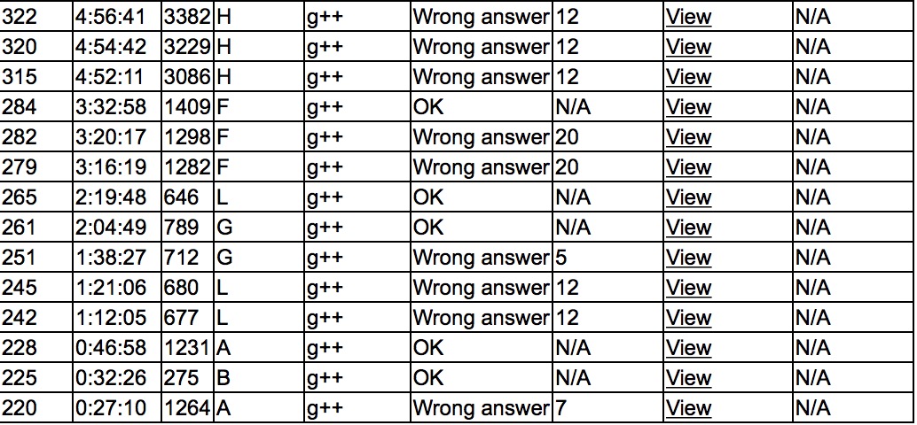 cjb开场打A wa了一发,后来打印调试,sub上机B1y32,cjb调试了之后A2y46,yzc写了一会儿E表示搞不定,改写L,结果L连wa两发,感觉是精度问题,打印后换sub写G,G也wa了...看着大家都4题了,很无奈,开始着急,中间挣扎了许久,终于G2y124,yzc换了L的写法,最后终于L3y139. 三人讨论了一会儿,让cjb上机写F,大概20多分钟后调试过样例,结果两发wa,后来发现自己特判的还是错的,改对之后F3y212. 让yzc写H,挣扎到了最后依然没有过,今天打得很差.