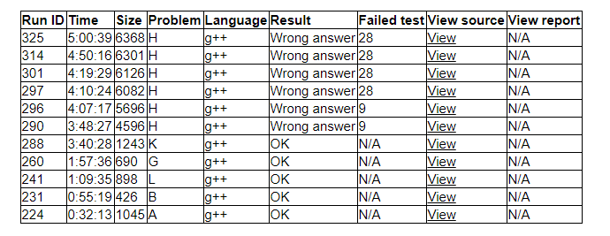 流水账:今天只有我和liurui学长。一开始,我从A题开始看,觉得是道签到题,然后觉得像维护LIS的栈一样去维护一下就好了,结果发现样例都过不了,然后改成了一个单调栈(虽然还是用了LIS里的二分,好菜菜。。)终于在半小时的时候水过去了。然后看了B,想了想,猜了一个关于GCD的结论,就也水过去了。之后liurui学长把L题切掉了。之后我看到G题构造题,很有想法,写了一发,发现n=4就炸了。liurui在四处开坑,FHIK的题意都看了一遍。我仔细思索了好久,把G题的构造方法想出来A掉了。之后我们在开的坑中选择,我一开始想去做交互题I,觉得比较有趣,然后发现并做不出来,liurui看了眼榜跟我说没多少人过,就不让我继续想这题了。在我想I题的时间里,liurui把FHK都想了一遍,把K题大致思路想出来了,让我先去看大模拟题H。我看完H,开始上手码,码完发现过不了样例,就打印下机debug。之后liurui把K瞬间切掉。我再上机debug,过了样例交了一发,WA9。然后改了一下写法提交了一发,还是WA9。之后发现最后一场球赛的比分范围可以超过10,改了一下WA28。之后又改出一个小细节,还是WA28。最后也没有调出来H。比赛结束一交流,发现H题题意读错了。