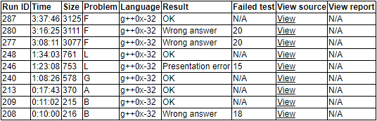 流水账:在获得了充足的睡眠之后,来到了机房。开场,wyz和chy开了B,我看了A,觉得可以二分做,然后发现没那么麻烦,找找最大值,然后发现平着的情况挺不好做,然后看了一眼Input,发现每个数字都不同,直接找找最大值就行了,恰逢两人把B题签掉了(WA了一发爆int)('''B2y11'''),就自己上去写了A题,达成了我整个队伍集训比赛中第一发自己AC的代码('''A1y17''')。随后我们看了一下榜,发现自己场内登顶了,开心地看了一下榜上3题的队都开了什么题,发现G题和L题,在wyz讲了G题的题意之后,我给出了一个构造的方法,描述没有很仔细,让wyz去写。随后听chy讲了L题,在思考了一会儿无果之后,chy提出了一个做法(我没太听懂),决定自己再想一个,然后很快推出了一样的做法,确信chy的做法正确之后开始G题和L题交替写(在写L题的时候是wyz发现G题的输出不对,来质疑我的构造,我掏出4种披萨的例子仔细讲解了了一下自己的构造,wyz觉得对了,想了一会儿写法)。然后就平稳地A掉了G题('''G1y68'''),L题则莫名出现了PE,询问了一下jtjl之后,表示输出格式没什么不对,涉及浮点数的PE就是WA。一段时间之后chy自己发现数组开小了,改了交上去之后AC了('''L2y94'''),看了一下榜,只有aftermath以十分钟的罚时优势领先我们,表示还能一战,wyz在chy调L的时候和我已经讨论发现E题就是一个简单DP,上去写了,在wyz敲E的时候我和chy一起把F题看了,觉得就是个签到题,之后大致就是E题和F题的交换敲代码,并且确定了之后的策略,我觉得E和F敲完可能会还剩一个小时,此时如果没有别的题开,就把H题(已经和wyz确认了是个码农题)开了,其余的考虑I题和K题。一开始我在想I题,在好不容易理解了题意(因为中间还会去看另两人的代码)之后,觉得大致倍增加上去可以确认一个下界,再差不多的做一做,就逼近到m了,然后再通过记录下来的数据减回去就行了,但是细节还要推,等细节推好了再和队友讲吧。在此期间,chy交了一发F,获得了WA,和我试了几组数据,感觉没什么问题,一会儿之后,chy提出全集怎么办,然后我们想当然地交了一个%[ -Z]上去,发现获得了WA,又在十几分钟之后,终于发现这个答案还是不对,改了一下特判终于对了('''F3y217''')。随后wyz继续调E题,五队在过了K题之后耀武扬威地到我们这边炫耀,表示I题到结束也就只有5个队过,劝说我成功放弃I题,转投K题。随便想了个关于点的贪心,和chy讲了一下,觉得也许不太对,但是在E题还在调的情况下也去敲了一点点。中间我和wyz表示或许可以重写了(一开始打算让他敲三个状态的,但是wyz最终选择了两个状态(这个当然听主代码手的了~)),最终还是舍不得代码(我也觉得时间可能不够)。到了最后二十分钟,觉得K题过的可能性不大(算法大概率有问题,代码也可能调不及),决定集火E题,然而代码已经破250行了,我和chy基本不可能看明白,也就5题到结束了。