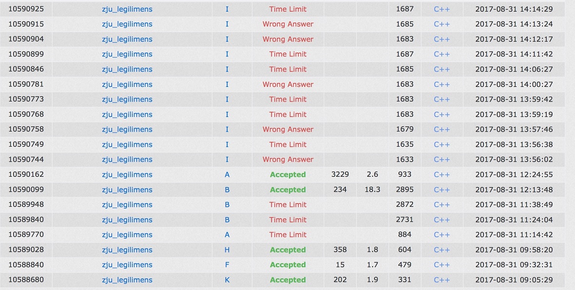 今天sub开始军训了,然后sub变成了shb,cjb和yzc表示可以抱堡的大腿了,十分开心. 开场shb从A开始看,cjb从E开始看,yzc从K开始看. 不久后yzc表示K是签到题,迅速打了一发,K1y5. 三人开始讨论起了F题,认为是分类讨论,强行套路了一波之后cjb上机写,F1y32. 然后发现大家在过H,一开始没有什么思路,shb提出从小到大扫过去,然后大家想了想就给出了个类似背包的做法,cjb上机写,过了样例之后错了手出的数据,改了个2B错误之后H1y58. 三人继续开题,讨论起了B,yzc和shb给出了一个比较麻烦的做法,cjb突然提出了另一种思路,获得认可,上机写B,40分钟写完后,打印调试,换shb写A,很快A过了样例,提交获得TLE,cjb继续调B,过样例后交了也TLE. 三人开始双开调整算法,cjb先是改了一发dp的姿势,依然TLE,后来cjb一边表示自己能够减少个64的复杂度,一边提出了个枚举次方大小的问题,yzc和shb思考了一下表示可以从220改成210,修改之后B3y193. shb也想到了A的优化方法,上机不久后A2y204. 剩下时间,三人尝试开G,无果,然后开I,讨论了很久进制转换的问题,最后yzc提出能不能直接把位数超过的直接去掉,获得认可,剩下40分钟的时候开始上机,过样例之后交了wa,发现小错误后TLE,后来开始调整扰动范围,一直在TLE和WA中来回,最后没能通过.