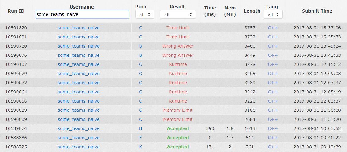 流水账:今天看快要迟到了,疯狂赶路,没有买早饭就到机房了(貌似每次我迟到全队就会爆炸得很惨?)。随后大家看到榜上A题和B题都在十几秒的时候被人过掉了,感觉很震惊,确信这俩队不是正常的队伍。大家开始各自看题,我看到榜上过K的人很多的样子,跟队友解释了一小会儿之后觉得讲解太麻烦了,题又简单,于是自己上去敲了,平稳地1A了这道题(K1y13)。大约此时chy和wyz也在讨论F题了,也和我讲了一下题意,我觉得ok啊,过了一会儿wyz就开始敲F题了。随后和chy一起讨论H题,一段时间之后想出了做法,chy表示是个背包,总之大家觉得可以这样做,在wyz过了F题(F1y40)之后就让chy上去敲H题了。然后wyz觉得优势很大,可以看一下全部题目,我则抱着A题和B题想,苦于不太会AC自动机的那套理论(今天打算学习一波),没什么思路,A题也万万没想到最后的解法是O(n²)的,于是就都没想出来。看到C题我觉得可能是个不太好写的lazy标记线段树,但是chy在过掉H题之后(H1y63)掏出了他的板子,表示用可持久化treap可以O(logn)做区间复制操作,然后我觉得可以,但是觉得极端情况要复制太多次,不太行,提出了可以倍增一下的操作,chy和wyz此时还不太明白为什么会进行很多次复制,我解释了一会儿,然后被暂时说服似乎不用,以为自己题目读错了,在缓过来之后斥责(并没有)了两位队友,chy觉得倍增不太理解,大家在找题开,一会儿之后我觉得机子空着不是办法,表示先把treap敲上去吧,打算自己上去敲板子,把智力活动交给两位,chy拦住了我,我表示倍增我写吧,于是他就去敲了板子,我则跟wyz讲了倍增的做法,在板子敲好之后完美甩锅给wyz。在此期间,我和他们分别想了一下A题和B题(wyz还想了I题)。一个半小时之后C题敲好了,大家兴奋地交了一发,获得了一发MLE,我觉得可持久化的操作new的点数太多了,大概可以减少一些,但是大家不太知道应该怎么做(并没有想到类似替罪羊树的直接拍平操作)(据说这样写能过,可能是拍平重建的姿势不对,赛后TLE了两发,还在修改中)(以及据说另外一种做法的删点操作很复杂,不太适合写)。于是就去想A题和B题,我们队的策略是把B题分配给chy,我和wyz则想A题,chy不负众望想出了一个AC自动机的DP,调了很久细节,在最后一小时的时候我和chy讲A题可以压缩,但是似乎没什么用,wyz猜测可能是个O(n²/64)的做法,并且想了出来,两人觉得不是很靠谱而且不会用bitset,就放弃掉了。中间似乎也有想过节约C题的空间的方法,看没什么人过,就扔掉了。到了赛后总结,听说我们的C题是正解,就差个拍平的操作,表示震惊。