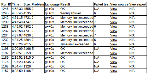 E题FFT没有看出来,对FFT还是不太熟练,写好之后交了一发MLE,以为内存都是1G所以瞎开了数组。J题最后一分钟卡过去了还是挺开心的,但是一共交了八发。写了200行之后交上去MLE的瞬间心里是有点崩溃的,当时只剩下大约二十分钟,就有点破罐子破摔的味道,优化了一点点空间(比如把一些int改成short)就试着交一次看看,如果能冷静一点,也许罚时可以少一些吧。