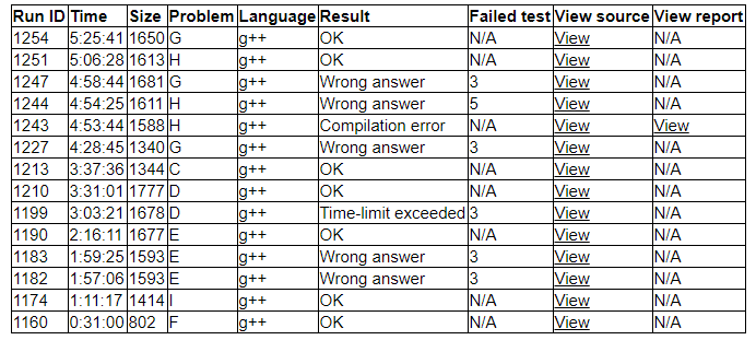 今天的题感觉稍微有点难?(其实不存在的)只不过我们速度实在太慢了,感觉签到题和中档题做的都不够快。我做D题的时候因为没有写过类似的程序,在背包合并的时候错了两次。C题没有想到状压,想到暴搜上去了,很错误,浪费了一些时间。E题FFT模板错误搞了半天。前面浪费的时间导致我们最后双开GH都没有成功(离成功就差0改成1和5改成300)。其实如果实力强一点,前面就不会浪费那么多时间,或者后面GH双开也能强行调出来。
