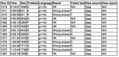 开场yzc从A开始看,cjb从E开始看,shb从L开始看. 很快shb就表示L是个简单的sg函数题,和tsr之前出的几乎一模一样,但是因为怀疑还有更简单的签到题,所以并没有马上去写,大家继续看题。没找到别的题,所以cjb让shb上去写L,L1y22. 发现board上很多队伍过D,三人开始讨论D,cjb给出了正确的贪心思路,大家脑补了个分割最长链的东西让cjb去写,yzc和shb研究K. cjb写完wa了两发,发现自己打成重儿子剖分了,又改又wa,然后很无奈地换yzc重写,然后yzc写完后D4y111. 期间shb想好了A的点分治,上机写A,cjb想出了F,和yzc确认了几个细节,在shb下机调试的时候写F,shb wa了2发后通过了A,A3y185. cjb不久后调出了F,提交之后通过,F1y218. yzc想出了G,和shb确认了做法后,想让cjb写预处理,cjb表示自己太傻,艰难写起了代码,然后就被yzc赶下了机子,yzc一人重新开G,shb和cjb想别的题,shb和cjb很快口胡通过了I,表示写不完,又回去搞K,最后挣扎到最后搞了个沿切线走的方法,yzc终于写完G,一发入魂,G1y290. shb赶忙上去写K,并没有成功,最后5题结束了比赛.