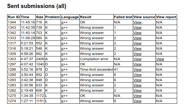 这次训练终于暴露了我们队在策略方面的一个问题:前期刷榜不频繁,不会及时放弃.开始的那一个小时,卡在了看起来像签到题的b和k,导致在第5min发现l是签到题,但大家都忙于自己面前那道题,都拒绝做l.一小时过去了,b和k一个都没做出来,txh 这时发现他对题意的理解有偏差,我在k没法跑出正解时觉得k并不是表面上这么简单,我们就滚下机位让给pzh签l.我和txh在旁边和对方讨论自己在做自己面前这道题时遇到的问题.pzh 做完l后继续写他觉得是边分治的a,等到他要写完,又意识到它的算法会被菊花图(就是存在点度数为O(n))卡死,改成点分治但觉得麻烦,于是就放弃了.期间,我想到了k的正解(但当时不确定),写好程序,过了样例就提交,wa2.然后照我的另一个猜想改了一下又交,还是wa2(赛后补题发现是被卡精度了),于是也弃疗.时间过去2.5h,这时我们再刷榜,发现大家都会做d.之前我们是有人看过d的,但是似乎因为英文太复杂就放弃了.三个人各读一遍后,再经过结合样例的讨论,发现问题主要在于求出树上各种链.首先是想到O(n3)预处理,但是显然效率太低.然后我提出一种想法,能O(n2logn)预处理.这是队伍似乎和出现了一个问题.每个人对预处理的方式都有自己的想法,都不愿意听别人的算法,只是希望别人接受自己的想法.于是,有那么几分钟,大家似乎都很不耐烦,不等别人讲完,就想指出自己认为的对方的漏洞.每个人都这样的时候,显然不利于问题的解决.作为队长,我力排众议(?),抢了机位去写我觉得的比他们的算法好写一些的我的算法.然后wa了...不到一分钟,发现有数据溢出,改了一下又交,还是wa,发现没有改完...改好又交,T41,应该是常数写大了.于是在队友的帮助下,我把priority_queue改成了vector+sort,这时我发现预处理还能优化,降一个log,于是也顺手改了,就过了.之后还有50min,经过讨论决定做a,试图写出能过菊花图的边分治的解法,然后以失败告终...等到决定写点分治时,只有30min了.因为我们的点分治的算法细节比较多,因此到比赛结束也没有写完.