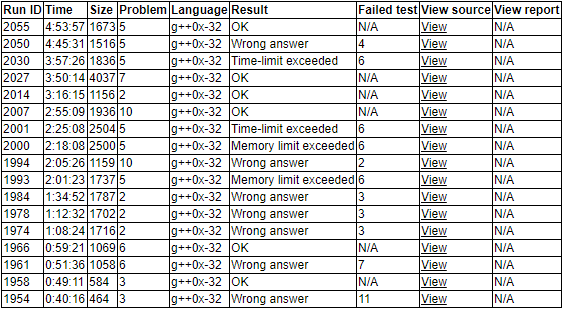流水账:今天开场看到很多队伍都飞快地签掉了B题C题和F题,chy做B题,wyz做F题,我则负责C题。在我看完题之后很快推出了一个简单的判断式,觉得随时可以敲,但是看另外两题可能也很快就能敲完的样子,就放在旁边,去看别的题了。之后wyz和chy先后没调出来,我抢了机子写了一发,觉得一点点精度差可能没关系,就偷懒没写cmp函数,交上去WA11了。坐到旁边觉得就是精度问题,耐心等队友们敲了一会儿之后又上去改了一下,这发很平稳地A了('''C2y49''')。其后wyz调出来了F题过程中WA了一次('''F2y59''')。chy的B题在之后的十分钟里也敲了出来,过了样例,但是却WA掉了,在讨论了一会儿可能出错的地方之后,发现了一个反例,改了一下之后反例也过掉了,交上去却WA了。在几次修改之后,chy心态崩了,我表示我和wyz已经开了J题(直接取两次中位数的做法),不要慌。看chy有换题做的意愿,表示赞同,让chy敲他说有想法的E题,wyz交替敲J题。接着两题敲好,wyz和我觉得G题就是一个简单网络流,我模型也画好了,就等囤积的题目做完来敲了。但是E题和J题相继出错,一个MLE+TLE,一个WA了。大家表示很慌,通过回想到远(gao)古(kao)时期知道的某个绝对值求和的函数是单峰函数的这个知识,我跟wyz说可以三分一下(以保证正确性),掏出python算了一下计算次数,觉得很稳,详细讲了一下,于是就让wyz去敲三分了。一段时间之后,wyz平稳地过掉了J题('''J2y175''')。此时chy心态非常崩的样子,但是在过掉十几分钟之后,chy跟我说,似乎发现了B题的错误。是读错了,我们三个读题的理解都是遍历整个有向图,而实际上只是要有一个回路。看chy很快地写了一发之后,在旁边提出了一点没考虑到的细节,之后再交就A掉了('''B4y196'''),全队表示人生大起大落,虽然花了太多的时间在这题上,但是过了还是稍微有一点点开心的,感觉chy的心态也不像原来那么崩了。然后我马上让wyz上去敲他的网络流,在一阵操作之后,调了一会儿之后,wyz把G题过掉了('''G1y230''')。此时还剩一个小时,chy觉得E题不那么好做,他想不到什么更好的解法,剪枝也没什么用,wyz表示不如集火K题。在我觉得不太行的同时,两人已经分别看起了I题和K题,我感觉这样下去要gg,然后掏出了python计算了一下bitset优化之后的E题的暴力做法,发现只有三千万(在此之前有想过这个做法,觉得太朴素了,而且数字看起来很大),跟wyz表示可以敲啊,获得了赞同之后,把wyz赶上去敲了E题,事后我觉得这个决策很理智。在最后十分钟的时候我们把E题过掉了,发出了欢呼('''E6y293''')。