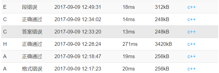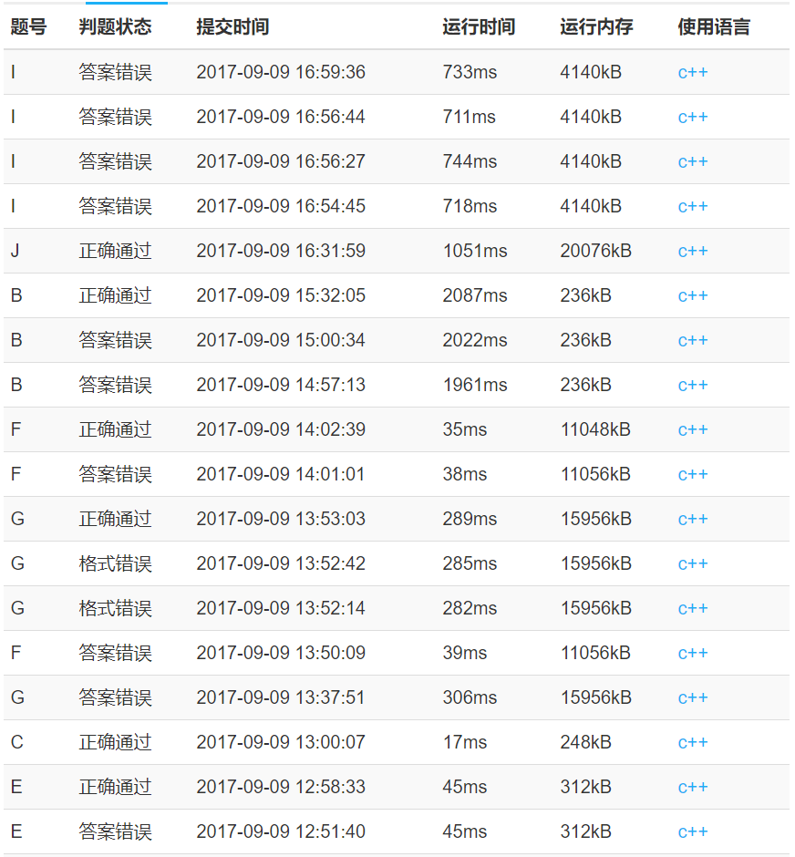 今天开场差几秒就迟到了。不过还好计蒜客网站比较垃圾,刚开场就都卡死了(吐槽*1),还让我安心吃完了饭。之后开心签到,发现了AHCE四道签到题,愉悦地签掉。不过过程中有很多罚时,比如PE啊(辣鸡题目答案间还有空行???吐槽*2),比如打错变量啊,比如少减一啊,比如用int读入了longlong啊。中间看榜时发现不知怎么回事垃圾计蒜客没有计算我们早就A掉的C题(吐槽*3),还要重新提交一发,罚时还是算后面一次提交。之后看了GF感觉是中档题(应该都算不上),F题的结论猜了半天,还好liurui记得做过类似的题目,回忆到了结论。sol先去做了G,过了样例交了一发WA了,下机去debug了。我把F敲完过了样例提交也WA了。我下机调试,sol改了一下,再提交又是PE,而且手抖点了两下,两发PE(辣鸡计蒜客什么提交界面,吐槽*4)。期间我发现我的程序把原结点个数当成颜色数了,改好提交还是WA了。liurui提醒我联通块为一要特判,特判完后就过了。之后我和liurui就开始想J题,sol看了B题。J题看起来很像网络流,而且带上下界的网络流的做法似乎比较明显。然而我们都不会,现场找板子学也没学会,套进去样例都过不了。我又跟sol稍微讨论了下B题,只讲了普通的情况,sol写了一发果不其然地WA了,然后一步一步地把各种cornercase想了出来,WA了几发后过掉了。之后还是我跟liurui继续看了J题,sol又去开I题。我们写的辣鸡上下界是真的辣鸡,样例都跑不出,浪费了我俩两个小时的时间。还好突然想到了J题普通的费用流建图,马上手打完费用流,期间看了下代价的范围,居然没有??(什么玩意儿,吐槽*5),开了个longlong把他给1A了。剩下半小时乱搞I题,胡乱猜的结论只对了一半,八题GG。