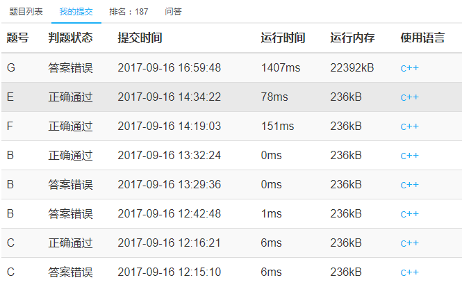 流水账:今天出人意料地,居然没有卡十分钟再开始比赛。一开场wyz看到了G题的题目名,说没准是个图论,我掏出来一看发现果然建树了。两位队友分别看了B题和C题,我看了E题,在他们做B题和C题的过程中我猜测了一个结论,应用它打了个表,作了个差,发现是个类似树状数组的求和,鼓捣鼓捣写了一个logn的求和方法,再鼓捣鼓捣,跟wyz说预处理一波就没了,其间他们分别过了B题和C题(C2y16)(B3y92),在听说F题过的人蛮多的之后,我看了一波,wyz说泰勒展开,凭借多年前高考的记忆,我表示你听说过切比雪夫多项式吗,wyz表示不知道,我掏出了递推式,以为快速幂解决,扔给chy,chy一段时间之后觉得貌似不能快速幂,我吸取了多年前通项公式做法用快速幂做的教训,掏出了通项公式,扔给了chy,chy表示这时限很稳,就上去敲了。wyz则发现了一点纰漏,过来和我讨论。这个纰漏是在求第6项和那里出现的,一会儿之后我发现后面的部分(模式和前半不同)可以求另一次和,跟wyz讲了一下,推了一个64*64效率的式子,wyz比较闲,自己推了另一个或许更快的式子。两人交替敲代码,平稳地过掉了这两题(F1y139)(E1y154)。此时大家发现G题似乎可以做,我提出分类讨论做,k小的数据倍增,k大的数据暴力枚举,之后就这题,大家纠缠不清地讨论了一会儿,让chy上去敲,细节似乎很多,不太好写,我看还有半场比赛的时间,觉得很稳,但是主要时间用来和chy一起做G题了。最后一个多小时时,wyz发现D题是之前某场比赛的原题,我一起回忆了一下结论,总之在最后一个小时的时候,G题还在调,D题决定写分数类,A题没什么思路,我看到数据觉得可以用unsigned long long来存,但是没有和队友说。然后到了结束的时候G题仍然没有调出来。