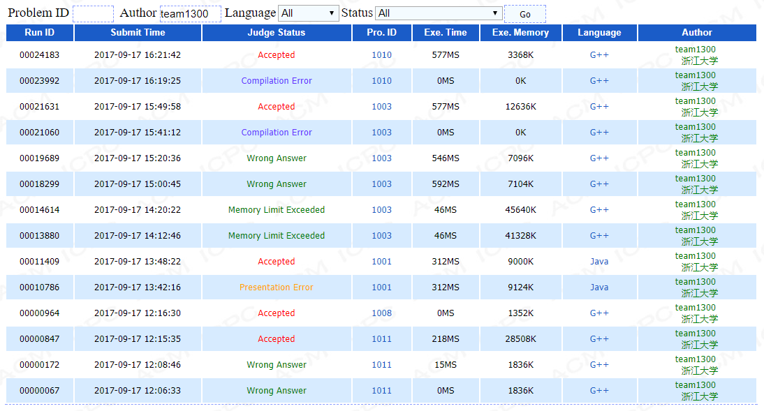 流水账:一开场,我们大家看到K题似乎是个水题,立方差公式一代枚举一下就好了,让wyz上去敲了。同时chy发现H题似乎是个签到题,表示只要知道十二生肖的英文就完事了,可惜不知道。随后我无语地发现题干里面有写,默默给chy指出来。随后wyz的K题WA了,表示不明情况,发现爆int之类的错误,改了之后冒冒失失地又交了一发,结果喜获两个WA。第三次终于对了('''K3y15''')。然后马上chy完成了中间敲的H题,一发A了('''H1y16''')。之后大家就把目光投向了A题,以及发现大家过的I题很多,我就提出了一个二分网络流的I题做法(错误),也找到了三角形外心的板子,wyz和chy觉得A题直接上高精度分数类就可以,完全不用考虑时间效率,就写了一些伪代码,然后用Java翻译了一下。总之坎坷地写了很久调了很久。在出了一次PE之后,发现似乎必须要用println来输出答案,才A了('''A2y108''')。之后我们就开始做C题,chy在此前和我讨论了一下C题的做法,朴素查找肯定是不行的,于是决定上SAM,我觉得也许会爆内存,但是也没有办法了。于是在一段时间之后,提交了C题,果然MLE了,chy改了一点细节之后上交,内存消耗更大了,情况不明。我觉得后缀数组的时间效率不太稳,chy给我洗脑,说这个时间效率没问题的,我就掏出了白书的板子,chy咔咔咔地敲上去,改了改,交上去跑得稍微久了点,但是仍然返回了WA。在我们对了n遍板子之后,改了一些细节之后,交上去却还是WA,不清楚到底怎么回事。在不久之后(中间还喜获了一次CE,因为define的最后加了个';'),终于发现是不小心输出了一点不应该输出的东西(调试信息),去掉之后果然A了('''C6y229''')(嗯,后缀数组跑得飞快)。中间wyz和我讨论了J题,貌似就是个加了队列优化的模拟题,wyz写了蛮久的,最后在一次CE之后(prev和next)获得了AC('''J2y261''')。随后我们打算敲I题,把最小割板子敲了上去之后发现我给的二分算法是有问题的,大家没有什么头绪,最后还有二十分钟的时候,大家选择了放弃。然后在赛后1分钟,问了二队这题做法,发现是一个很早以前学OI时就会的小技巧,并且完全可以在15分钟内敲出来。让wyz去敲了一发,咔咔咔10分钟就做好了,发现补题还没开,等到补题开通之后,交了一发,非常稳地A了('''I1y335''')(假装过题)。