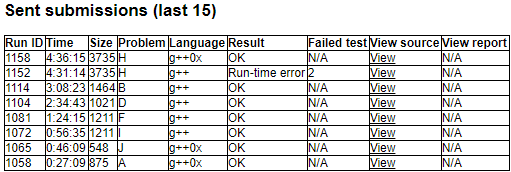 开场shb从头开始看,jsb从E开始看,sm从J往前看。sm表示I是数位DP,可以写,但是可能要花一点时间。过了一会儿shb觉得A是傻逼题,但是感觉可能要写线段树,jsb表示瞎倍增贪心一下就行了,上机写,A1Y27。然后讨论了一波J,jsb感觉没有随机没法做,然后一起算了一波概率,感觉选最大的若干个很靠谱,shb上机写,B1Y46。sm静态调试也找到了I的问题,I1Y56。之后jsb表示F似乎有个循环节不超过10P的结论,上机打表发现确实很小,加个矩乘就能做了,F1Y84。这段时间shb和sm讨论D,shb猜测结果可能是确定的,与策略无关,只要实现一个三角剖分就行了,但是感觉共线不好处理。很久以后,sm突然发现共线好像也是同样的贡献,于是只要凸包就行。然后jsb写了个凸包,sm补充完主程序,D1Y144。然后jsb单挑了一发B,直接分治,B1Y188。然后大家开始做当时剩下唯一有人过的H,推了一波dp,shb回忆起了一个CF上的分治+FFT的做法,上机写。但是最后发现FFT、暴力卷积在大样例跑出了两个不同的错误答案。调试以后发现FFT的精度爆炸了,但是不知道为什么暴力也错了。sm看了一分钟就发现主程序里混淆了两个模数,改了暴力就能过了orz。然后jsb掏出了FFT大力取模的板子,写完就过了大样例。交上去RE2,找了一波错。shb认为30000*30000的FFT数组只开10w不够,改成20w又交了一发,这时opentrains挂了,于是大家开始挂机喷opentrains。突然jsb感觉10w是够用的(60000向上取幂只有65536),于是又开始紧张刺激的找错,但是很久以后莫名其妙刷出了一个OK,H2Y276于是就这样结束了。。