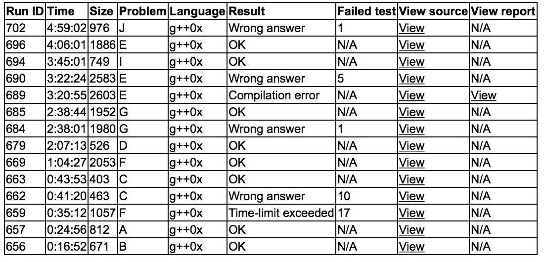 开场各自看题,yzc觉得A不太好签,于是挑了,cjb觉得F很可做,把sub拉来讨论了一波,yzc上机写B,写着发现了更加科学的写法,'''B1y16''',然后发现大家纷纷过了A,yzc拉sub讨论了一下A,上机写A,'''A1y24'''. cjb决定上机给F写个暴力,然后tle了. 下机之后sub和cjb讲了讲F,然后就会做了. yzc上机写C,wa了一发后'''C2y43'''. cjb上机写F,'''F2y64'''. 因为开场sub就说I会做,于是在cjb写F的期间,sub和yzc讲了I,yzc在F过了之后上机写I,sub把G要做的事情告诉了cjb并让cjb准备去写. yzc写I写了一段时间,发现不太对,就让cjb先写G,后来过了一段时间又把cjb换下去又写了一小段时间的I,不过并不能过样例,于是yzc把锅丢回给sub. sub此时上机把之前推好的D敲了,'''D1y127'''. cjb上机又写了30min,忘记删文件读写wa了一发,然后'''G2y158'''. yzc上机写模拟题E,许久后先是CE然后wa了一发,下机打印检查,sub上机写I,'''I1y225'''. yzc上机调E,和sub讨论发现题意又出现了小小偏差,此时外卖来了sub和cjb开始吃午饭,yzc不久后修改通过,'''E2y246''',我们8题了,一队七题之后,似乎在刚H或者I,然后后来我们都不太想搞H,sub一边和我们聊骚,一边尝试搞J,无果而终.