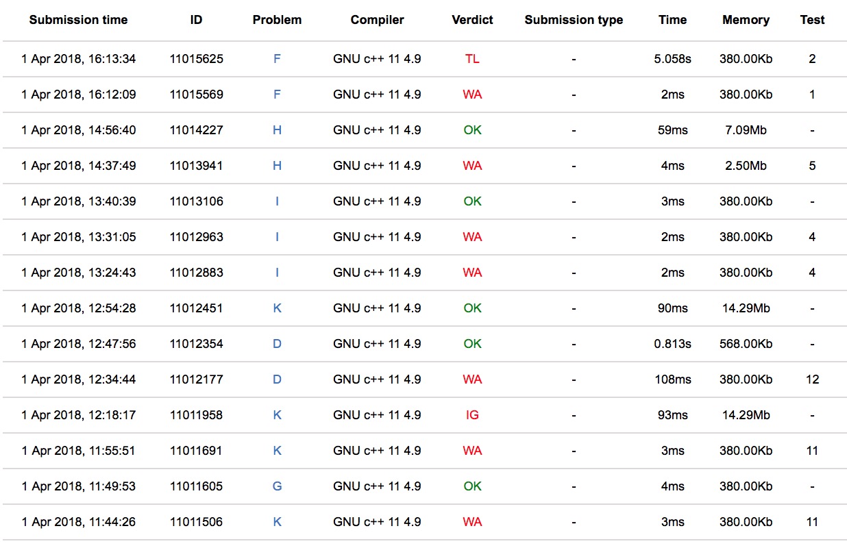 开场各自看题,K和G同时有人过,sub上机写K获得wa,cjb和yzc讨论了G,上机G1y34。sub K又wa了2发,cjb帮忙查错,感觉很稳,发了问题给judge。之后yzc上机写D,wa了之后yzc上机对拍,这时返回来说K题面有问题,改了之后rejudge了,很不幸的就是我们之前的题意也和最后题意不一样,之后D1y92。sub上机K3y99。之后三个人研究I,dp和贪心弄了很久后,sub给出了构造,yzc上机获得wa,想到了一个corner case,改了之后还是wa,不得已写了checker,发现特判忘记输出方案数了,I3y145。之后三个人讨论H,sub给出了做法,yzc上机H2y221。最后先是做B,cjb上机弄了个kdtree,后来发现不太行,换做F,最后10min给出了疑似正解,没rush出来,5题结束比赛。
