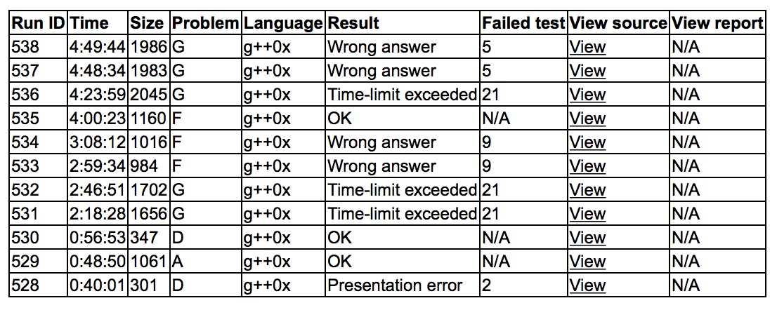 开场各自看题,不久yzc判断A是个傻逼题,此时有人过D,三人一起看D,感觉D需要推式子,yzc推了一段时间后上机写,写完后过不了样例,下机验算式子,此前已经确认过做法的cjb上机写A,后来yzc换下cjb,40分钟的时候交了第一发D获得奇怪的PE,cjb继续写A,A1y48. sub突然问到会不会是除0的情况,yzc意识到需要加一个特判,加了之后过了,D2y56. 接下来三人把除了B以外的题都看了看,发现大家在做F,然后三人判断K是个lct,但有一个操作还没想到很好的处理方法,就让cjb上机敲lct板子,中途sub和yzc基本确认了F是个斜率优化dp,cjb敲完板子后让sub上机写F. cjb和yzc尝试开题,看到G的时候,感觉暴力是109,在想能不能加点优化艹过去,cjb突然意识到板子上有一个位运算优化的同样问题的板子,yzc和cjb算了一发复杂度后感觉刚好够,换下sub去魔改板子,因为对板子不熟悉,中间花了点时间,最后两小时多的时候通过了样例,提交获得tle,打印了代码,让sub继续写F,cjb和yzc决定在板子的基础上进行各种优化,优化它手写的bitset,改函数为引用等等,半个小时后又交了一发,还是tle. sub终于调试出F,提交获得wa,后来改了改还是wa. cjb决定自己上机敲对拍,让sub给yzc讲代码,后来对拍小数据出了几次错,sub修改后在封榜的时候通过了F,F3y240. cjb和yzc决定最后挣扎一下G,因为本地已经优化到了1.8s,感觉再努力一下就可以了,让sub去思考别的题,cjb和yzc试图使用int128,但还是tle在同一个点,最后sub觉得J上一个平面图的板子就能过了,cjb上机飞速敲板子,sub在最后十分钟努力挣扎,最后还是没搞定,最后3题结束了,Siunaus最后5题,TaZoF和Dominoes最后都是4题,还是比较可惜,我们队做几何题和类几何题都要向风学长学习啊,太稳健了啊!