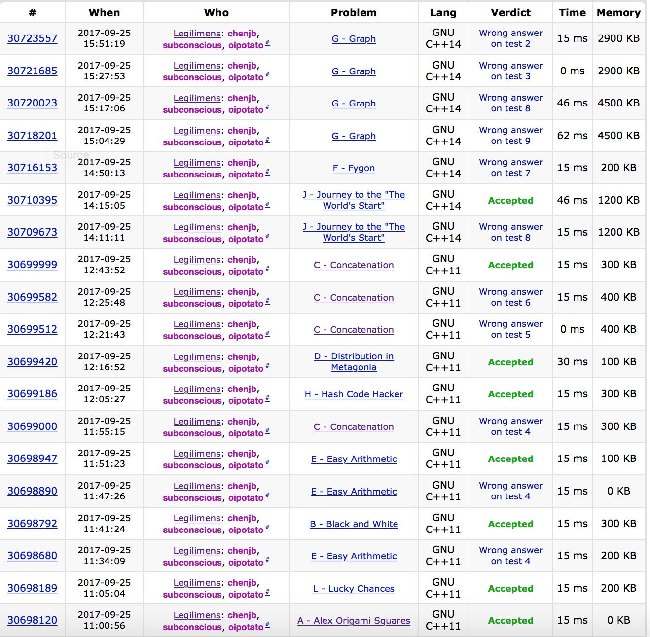 开场yzc和sub先后签掉了A和L,'''A1y5''','''L1y24'''. cjb和yzc确认了E做法后上机写,打印调试,换sub写B,'''B1y46''',yzc决定重写E,还是wa在同一个点,后来突然发现贪心有个傻逼错误,修改后'''E3y56'''. cjb大概想出了C的做法,上机迅速敲一发后获得wa,sub上机敲H,'''H1y70'''. yzc上机敲D,'''D1y81'''.cjb发现自己做法的错误,又上机写C,还是wa,后来修改了改又交了发wa,心态爆炸,最后在sub的指引下终于修正了做法,敲了暴力试了几个数据才敢交,最后AC,'''C4y108'''. 接下来很长一段时间,三人合力做J,但不会做,又没有太好开的题,十分尴尬,三脸懵逼。最后过了许久,终于发现,sub读错了题…修正题意后迅速想了出来,sub wa了一发后AC,'''J2y200'''. 接下来时间,yzc写F的模拟题,cjb和sub思考G,yzc写完后交一发wa,发现需要高斯消元处理一下,sub上机写G讨论出来的做法也获得wa,后来一直在修正各自的做法,但因为前面的J浪费太多的时间,最后没能调试完成,赛后先后过了G和F。