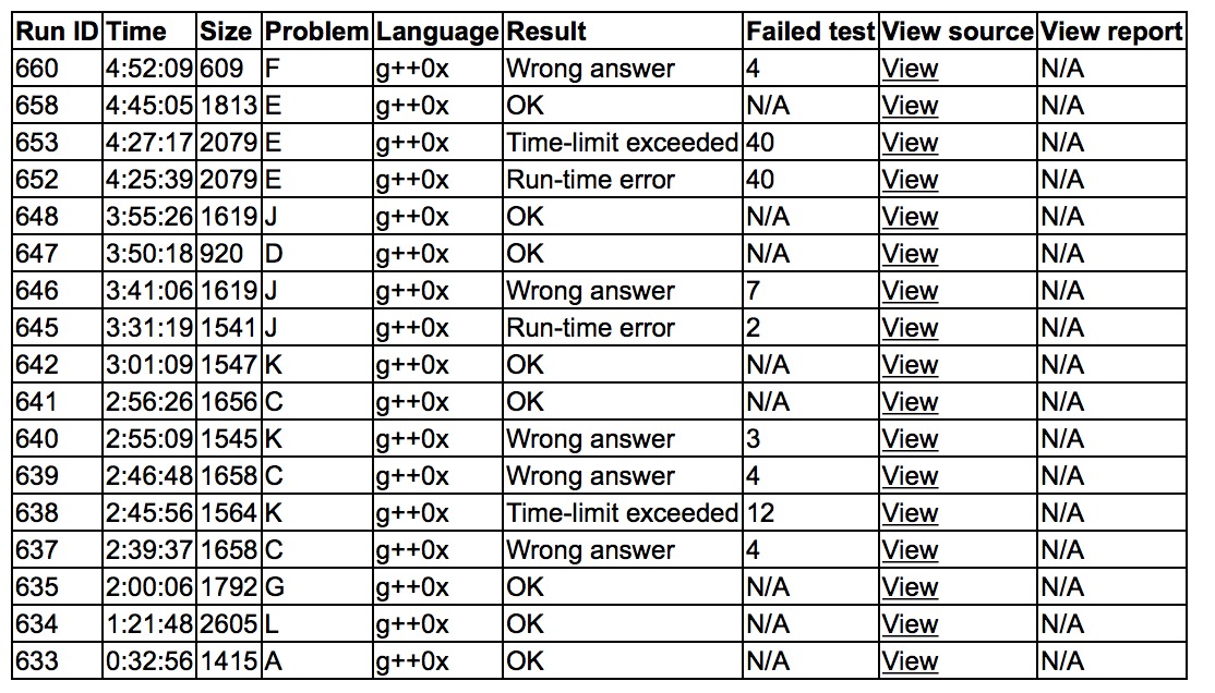 开场各自看题,有人猛得过A,然后claris突然过L,三脸懵逼,yzc强行上A,A1y32。cjb想出了K做法却决定摸一会儿,sub试图上机写J,结果爆炸,cjb和yzc讨论出了L,cjb上机抄dominator tree板子,yzc补上,L1y81。cjb秒了G,让yzc上机写主代码,cjb上机写spfa,G1y120。yzc和sub讨论了C,cjb上机写K,之后交替上机,C获得wa,K获得tle,之后C3y176,cjb改成单哈之后wa了,查出小bug,K3y181。三人讨论想出了J的正确分治,yzc上机获得wa,sub上机写D,D1y230。之后终于找到J的错误,J3y235。cjb发现E是个old题,和yzc一起上机,tle后撸了个hopcroft过了,E3y285,sub上机rush F,wa了一发未能通过。