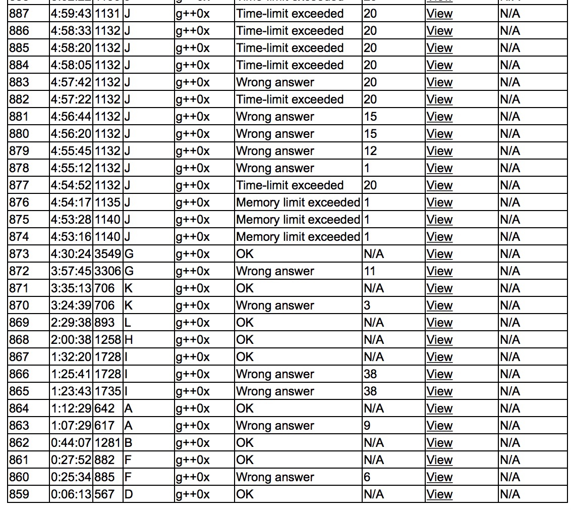 开场各自看题,yzc迅速上机D1y6,之后F也是签到题,F2y27,cjb上机写B,B1y44。cjb和sub开出了A,丢给yzc,A2y72。cjb想出了I,上机获得wa,和yzc一起看了看发现是数字算错了囧,I3y92。sub终于想好了H,上机H1y120。cjb想了个结论丢给yzc写L,L1y149。sub和yzc开出了K,yzc上机wa了之后sub上机调边界,K2y215。cjb之前上机敲了闵可夫斯基和的板子,sub上机调G,wa了之后对拍找了错误,G2y270。最后迭代rush J,在mle和tle和wa的边缘试探,未能通过,cjb和yzc假装口胡出了B。