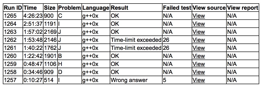 开场各自看题,sub表示会做I,上机wa了。cjb想好了D,和yzc讨论了mex的求解,sub很快开出了D,上机'''D1y34''',yzc紧接着上机'''H1y48'''。cjb开出了B,上机'''B1y82'''。sub和yzc讨论了J,sub上机写J,tle了两发,压了常数过去了'''J3y117'''。之后sub和yzc开构造题G,cjb开I,cjb和sub讨论了I的构造证明,大力一发'''I1y171'''。之后cjb单独开C,sub和yzc继续搞G,之后cjb有了思路,和sub聊了好几次,最后'''C1y266'''。G一直在爆搜调整,一直和满足条件的构造差一点,没能艹过去。