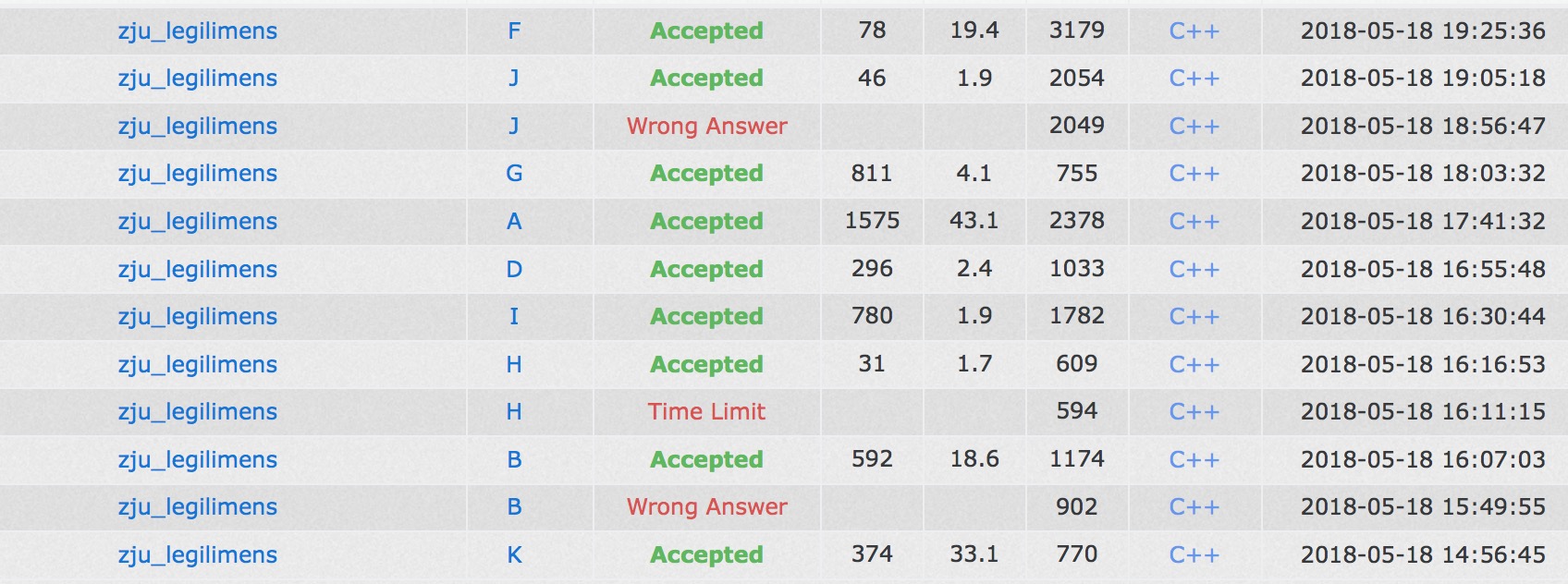 开场各自看题,sub上机写K,搞了一会儿'''K1y20'''。之后sub继续搞B,wa了之后和暴力对拍找到问题,'''B2y91'''。yzc和cjb讨论后上机bitset冲了一发H,tle,cjb发现性质,'''H2y100'''。cjb上机敲了最小树形图板子,yzc上机补充,'''I1y114'''。sub开出了D,上机写D,'''D1y139'''。yzc继续写一万年前讨论出的A,'''A1y185'''。cjb和sub讨论了很久G,将信将疑上机冲了一发'''G1y207'''。cjb上机写F,yzc和sub开出了J,考虑了下时间,cjb敲了dinic板子让sub上机写J,wa了之后cjb继续写F,之后'''J2y269''','''F1y289'''。