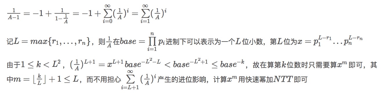 * E:听说是个知乎数学题....要贴个大整数NTT的板子,记得要用快速乘@zimpha,另外记得乘法后要基于base进一次位。其余如下:[[BR]][[Image(E.png,800px)]]