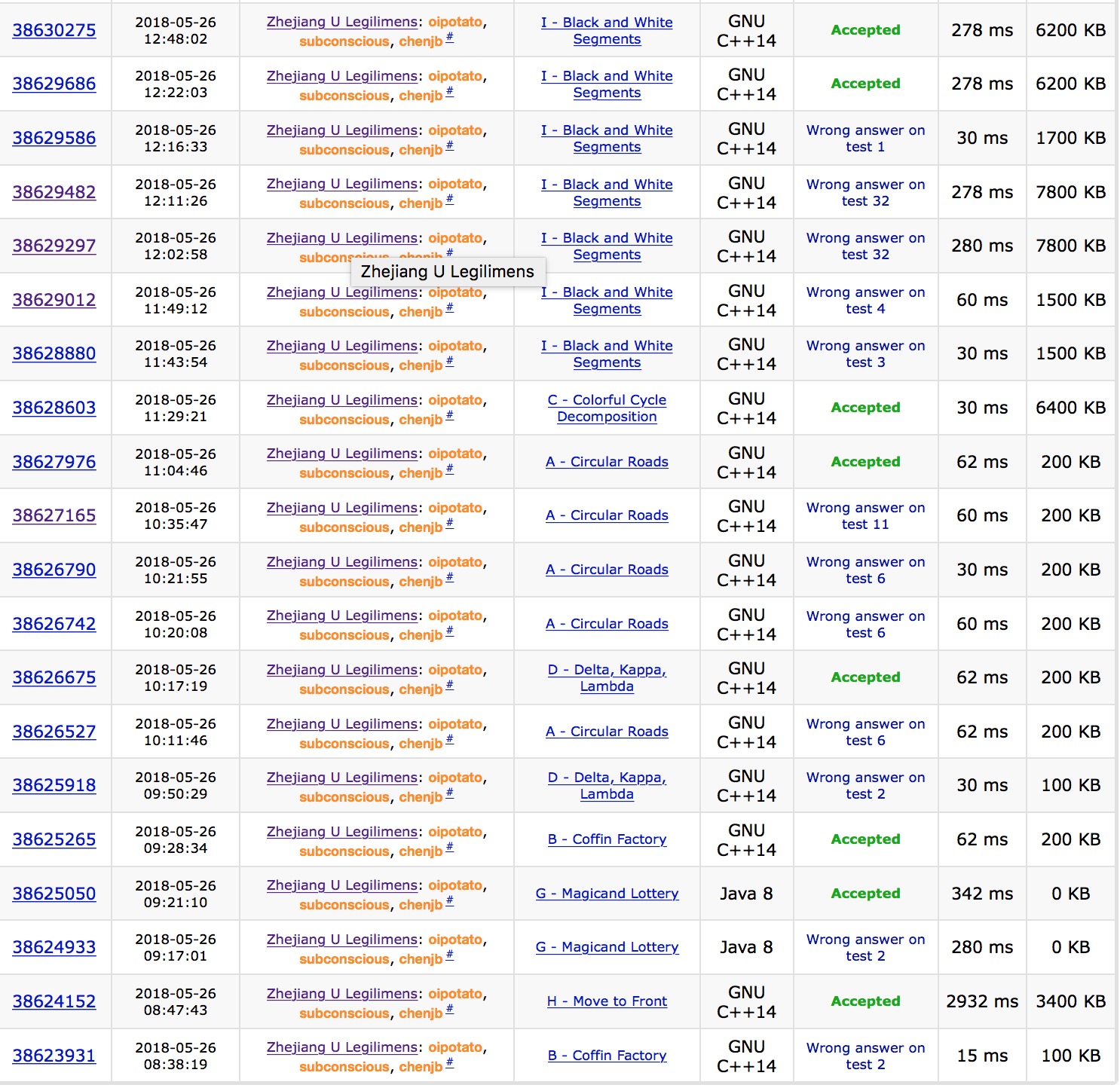 开场各自看题,不久后cjb上机写B,wa了。发现有人过H,yzc试图上机抄平衡树,cjb劝说yzc使用rope,'''H1y27'''。之后sub上机写G,之后发现要java,cjb改了之后变成wa,检查发现sub读入写反了,修改后'''G2y61'''。之后cjb想到了B的wa原因,'''B2y68'''。yzc想了D的构造,获得wa,sub上机写几何题A,wa。yzc想到了正确的构造,上机'''D2y117'''。之后cjb开出了C,上机敲了个dinic然后让sub继续调A,A wa了很多发,之后sub写了对拍,'''A5y164'''。cjb上机写C,'''C1y189'''。yzc上机写I,wa了之后对拍拍不出来,cjb提出一个corner case,修改之后wa 32,cjb发现yzc进行了错误的哈希,修改后终于'''I6y242'''。最后一个小时sub上机写F,赛后十几分钟才通过。