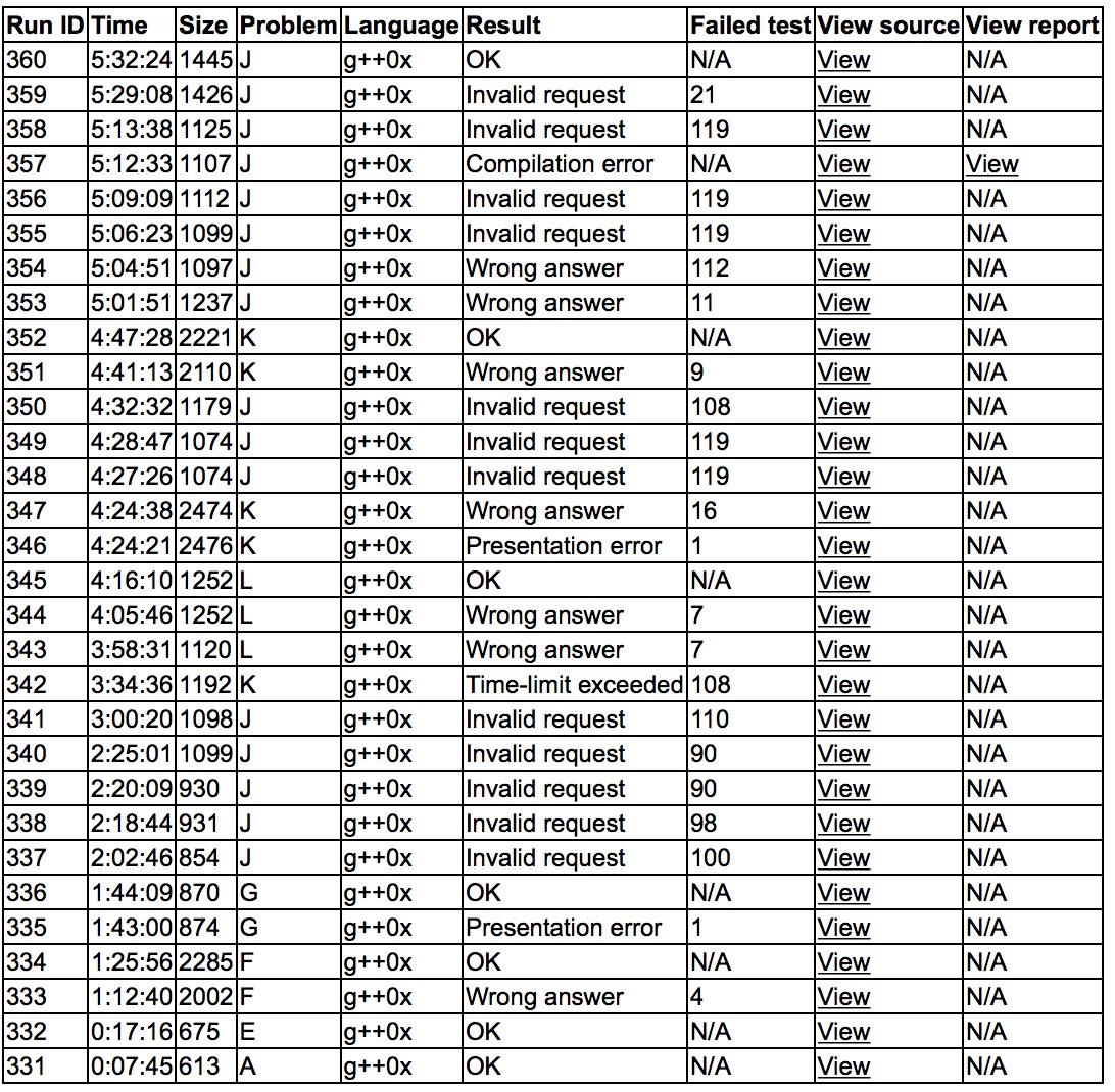今天做近期最后一场neerc,neerc 2015. 开场各自看题,yzc迅速发现A是签到题,上机写了一发获得通过,A1y7. cjb读完E后也判断是签到题,上机写,不久获得通过,E1y17. sub上机尝试写B,不久宣布弃疗,cjb和yzc讨论了几道题,决定开J和F. cjb一开始提出了F的做法被yzc简单地否决了,后来渐渐有人过F,cjb又确认了一次,发现其实是对的,yzc上机写,写了一点后决定让cjb写,yzc和sub讨论J. cjb上机写完wa了一发,很快找到了一个corner case,修改后获得通过,F2y85. sub上机写G,写完后不小心没加文件读写PE了一发,修改后AC,G2y104. 三人陷入了无题可写的境地,挣扎了很久,yzc决定对J上随机,写了一发结果wa在了98个点,后来又各种尝试,始终在90-120个点的时候来回wa.cjb想到了K的大致思路,和yzc确认了一下之后上机,最后在108个点的地方tle. 此前sub大致想到了L,确认做法后决定上机写L,但是写着写着怀疑人生,最后让yzc来写,wa了3发后在封榜的时候获得通过,L3y256. cjb非常坚信K是个爆搜,在yzc写L的时候和sub讨论,得到了一堆剪枝和优化,在L通过后继续写K,后来又wa了几发,最后修改后终于获得通过,K5y287. 在此期间一直到最后,yzc和sub一直在坚持不懈地优化随机,始终过不去,最后6题结束。赛后sub写了一发纯随机结果过了,发现自己期望实际上算错了,比较遗憾。