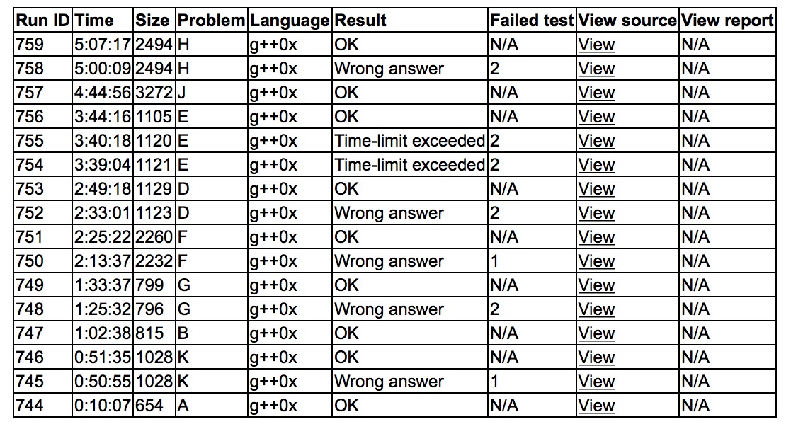 开场各自看题,yzc上了一下A,过了,A1y10。有人过了J,三个人迅速得出了做法,cjb上机准备了tarjan,之后sub表示要抢K一血,上了K,wa了一发样例后艹过了,K2y50。cjb给yzc理论了B的正确性,让他上了一下,也过了,B1y62。cjb和yzc读了G,丢给sub,sub上了一下,G2y93。cjb觉得F很稳,上了很久,很难过,觉得样例错了就交了一发喜获wa,之后冷静下来发现自己社保了,上了一下就过了,F2y145。sub和yzc理论完了D,sub上了D,D2y169。之后让yzc去写H,三个人感觉稳了开始浪,结果yzc写了30min发现根本不行,cjb赶紧上E,tle了两发后就过了,E3y224。yzc继续上H,感觉不太行,cjb和sub赶紧上J,J1y284。之后yzc写H,完场9s交了一发,结束后7min获得通过。sub在yzc写H的时候尝试爆C失败,三个人微笑打出GG。