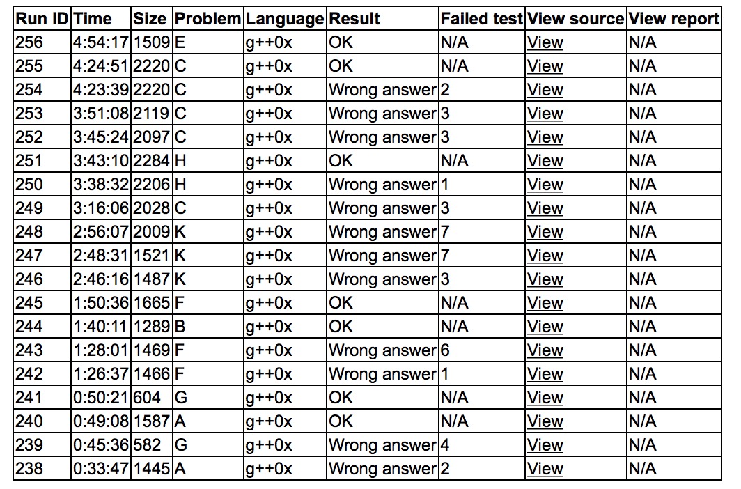 开场cjb读了A,以为是最签到的题,骗了yzc上去,yzc写啊写终于wa了。之后sub上机写G,又wa了。yzc找到了错误,A2y49,之后sub G2y50。cjb终于可以上机写真正的两道签到题了,然后cjb就猛wa F,冷静了一下把代码丢给yzc,继续一发B1y100,之后终于F3y110。sub上机写C,之后cjb上机试图乱搞K,wa了3发感觉没救了。sub继续写C,之后获得wa。cjb和yzc读了H后很有想法,讨论了很久,之后终于想到了对称性,sub wa了之后yzc上机写读入,cjb抄tarjan写topsort,之后莫名wa 1,找到了2B错误后H2y223。之后sub疯狂写C,终于想到了自己问题,C5y263。之后让sub上机rush E,一发E1y294。