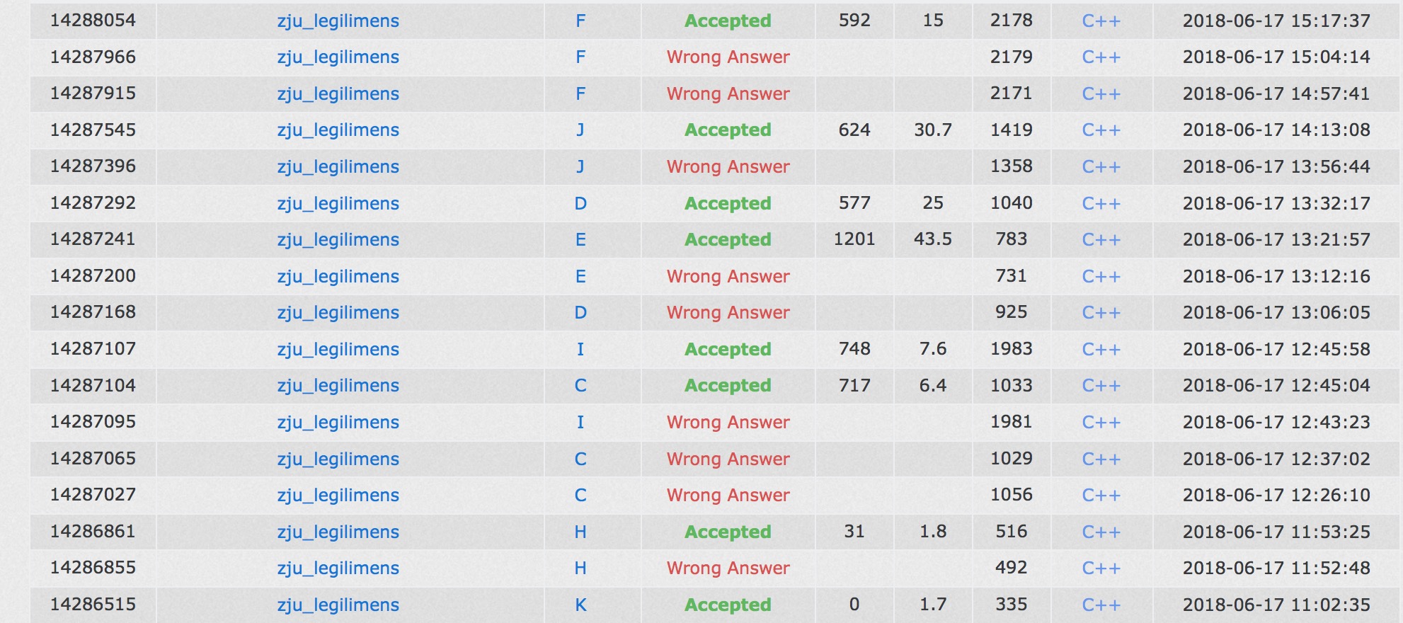 开场各自看题,sub高速上机,K1y2。然后各自想题,cjb上机写I,花了很长时间。刷了一下榜发现H被板刷,sub不会做,感觉过的人太多了,猜了一发结论,cjb傻傻快速幂写错了,H2y53。yzc和sub讨论C,然后yzc上机写C,,cjb查自己的I去了,之后yzc C3y105,cjb此前交了一发wa,立马发现错的地方,修改后I2y105。cjb和yzc口胡了一下D,yzc上机wa了之后发现做法有问题,写了对拍,sub在刚E,大力猜了发结论wa了。之后sub发现没多组数据,E2y141,yzc想到做法,改了之后D2y152。cjb一直在想J,大力上了个结论,让yzc证明了一下,之后获得wa。感觉很难过,对拍了也没错,cjb把dp转移边界写得严谨了一些,又查了lca,再交就过了,J2y193。之后cjb上机抄NTT,sub上机写F,yzc一直想G,cjb想B,都不太行,之后sub F3y257。