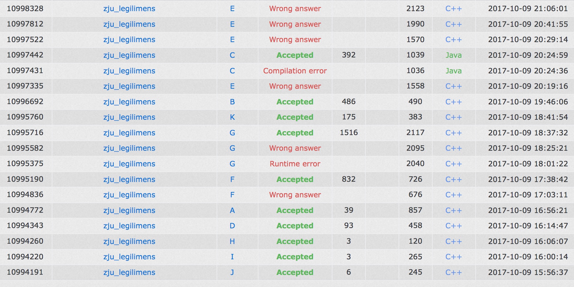 今天本来不训练,yzc和sub还是想做题,就稍微改了改训练计划,挑了场大家都说很垃圾的16大连来随便做做,之前就听reku学长说要AK才能出线,所以开场就奔着AK去的...开场各自看题,犹豫之际发现大家纷纷过J,cjb迅速读了一发题就上机写了,'''J1y6'''. 接下来sub上机做I,'''I1y10'''. cjb和yzc讨论了一下H,cjb上机写H,'''H1y16'''. sub紧接着上机写D,'''D1y24'''. cjb早就发现G是点分治,迅速敲了一发点分治板子. yzc上机写A,cjb随便敲了个2-sat的板子,yzc调完之后,感觉不太对,和cjb讨论了下样例,发现有一个可能是clarification才补充的题意..cjb觉得2-sat不太稳,但yzc觉得没问题,不久后被cjb的数据叉掉了,yzc改回染色,最后'''A1y66'''. sub和cjb此前就把F做出来了,在yzc下机和cjb讨论的时候sub就上机写F. A过了之后,sub接着写F,但是wa了...cjb和yzc都没办法叉掉sub的代码,很无奈,cjb上机写博弈论C的暴力打表,yzc帮sub查错. C打了表之后,发现一个不太能搞的规律,yzc上机打算继续叉sub的F,突然发现sub的读入格式不对...改了之后就过了,'''F2y108'''. cjb上机继续写G,yzc在一旁帮忙盯着,很快写完后过了样例,提交就re了,yzc写了个出数据的程序,cjb在机上调试,发现了好几个错,改了之后变成wa. cjb只好打印下来查错,sub写独自思考出来的K. cjb突然想到之前特判的一种情况现在可能错掉了,拿过机子一查发现果然这样,修改之后就过了,'''G3y167'''. sub写K,不久后'''K1y171'''.现在只剩下三题,然后都不太会做,就停下来了一段时间,因为感觉B用fft可能可以卡过去,就让sub上机写了,cjb和yzc讨论E,但是sub写到最后发现数组开不下…于是只好换yzc写E,sub过了一段时间想到B其实可以用bitset乱搞过去,然后'''B1y236'''. cjb有事情先走了,yzc上机写E. cjb后来查了叉姐的一个formula.pdf,找到了C原来是个经典结论题,sub此时也推出了黄金分割率,于是cjb就掏出手提电脑用java写了一发C,然后就过了...'''C1y274'''. 最后yzc上机写E,因为算出来会爆long long,无奈之下只好写高精度,然后高精度出了点差错,就wa了三发一直到最后没能AK,最后结束后20min yzc通过了E. 后来看到网上别人的代码,E根本只用了long long,拿下来发现人家的代码会爆long long的,估计现场其实有clarification.....没能AK比较可惜,但是也没出大的差错,那个formula.pdf以后要带着打比赛了...