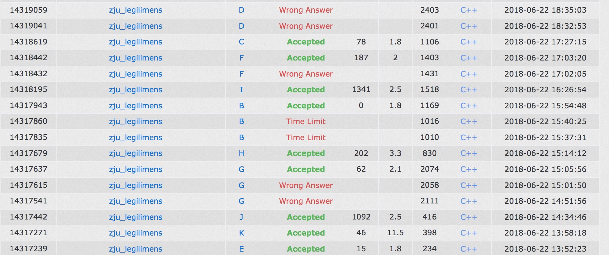 开场各自看题,榜上有人过K和E,于是'''E1y12''','''K1y18'''。sub和yzc开了一波J,大力找了规律,yzc对拍了一下'''J1y54'''。cjb上机写G,反向边没初始化,'''G3y85'''。sub上机'''H1y94'''。yzc和sub讨论了B,yzc上机tle之后debug了一下'''B3y134'''。sub拿了个二次剩余板子'''I1y166''',cjb上机写F,没删文件名'''F2y203'''。sub和yzc讨论了C,'''C1y227''',之后rush D,cjb敲了三元环板子,sub上机rush,赛后10min通过。