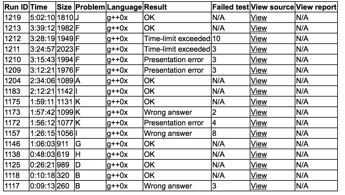 开场各自看题,大家疯狂过B,cjb猜了发结论wa了,发现自己没有特判,'''B2y10'''。之后cjb又写了D,'''D1y26''',sub上机写G,cjb中间上机'''H1y48''',之后sub '''G1y66''',yzc和sub讨论I的式子,之后yzc上机写I,wa了,cjb开出了K,上机也出现了问题,之后发现自己没有特判,'''K3y119''',cjb发现yzc的问题,'''I2y132'''。sub上机写A,'''A1y154'''。cjb上机在sub的预处理下乱搞F,有些bug,之后猜了个结论'''F5y208'''。之后三个人研究J,得到做法后yzc上机写了起来,最后赛后2min获得通过。