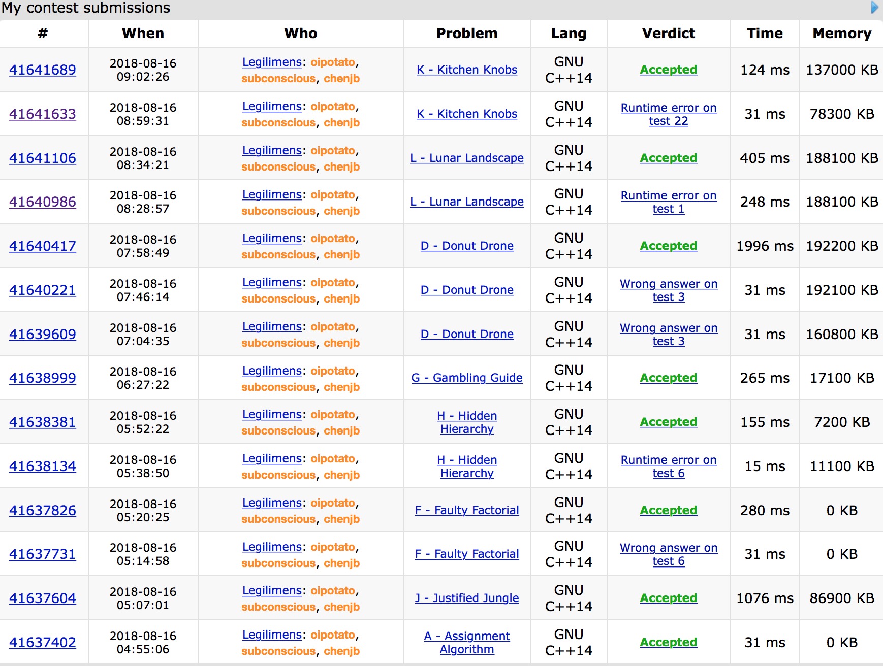 开门各自看题,cjb丢了个模拟题给yzc,sub试图上机写K,发现有问题,yzc A1y35拿下一血。cjb上机J1y47,sub上机F2y60。cjb又丢了个模拟题给yzc,H2y92。cjb和sub讨论了G,上机G1y127。此前cjb和yzc谈久了D的做法,看下罚时和排名还行,大力写D,cjb敲了个lct板子,之后写了许久,wa了之后对拍查出各种bug,D3y218拿下一血。sub和cjb开了K和L,之后上机L2y254,K2y282。