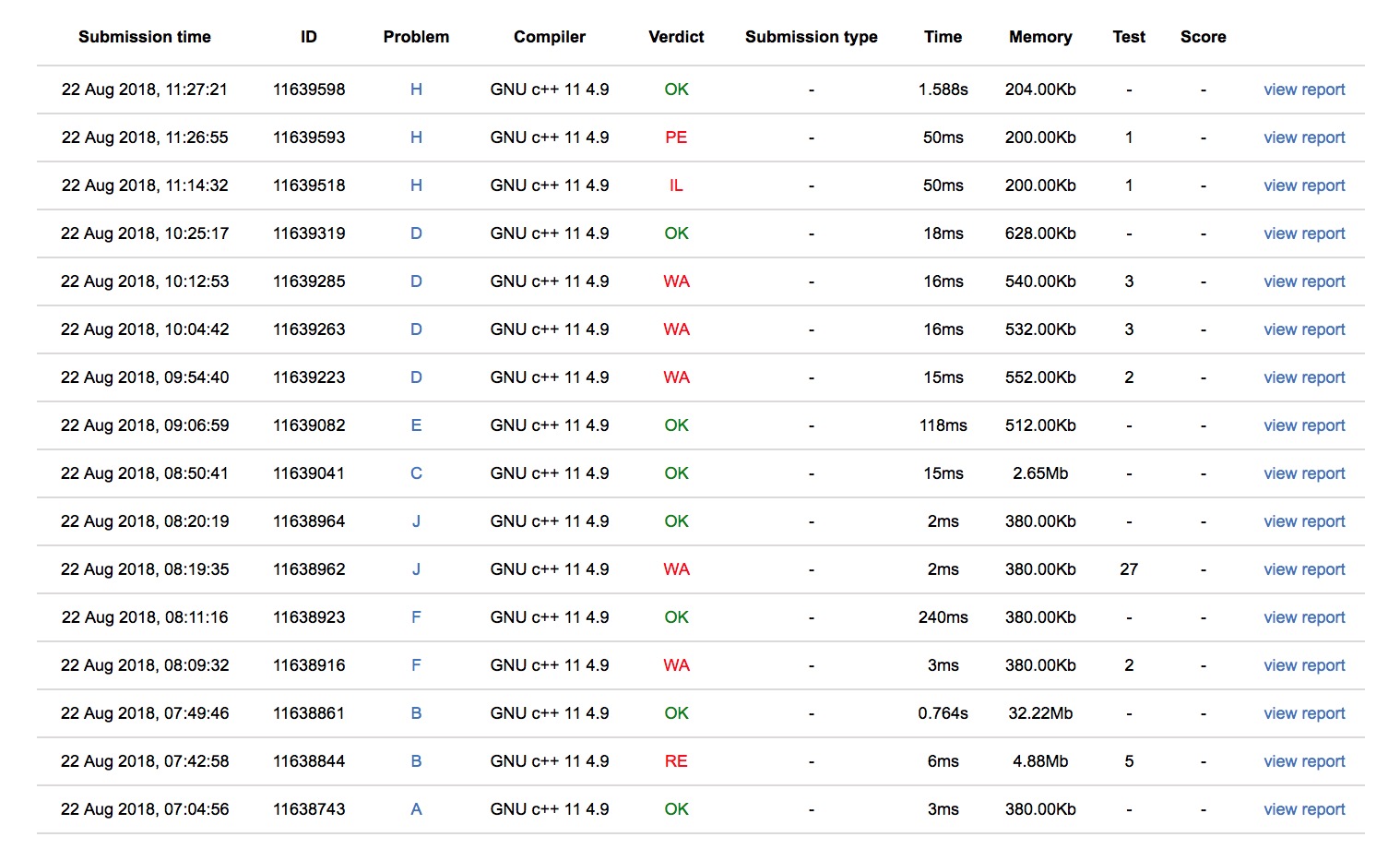 今天的节奏也很好,但是前面有点拖沓,罚时也高,导致一直是同题数垫底或者倒数第一第二,sub的J很妙,另外一个就是D一直都在拖后思考,其实那个时候可以考虑封榜后再过,不过因为没什么信心,也handle不了。今天的题目风格总体而言非常清奇,交互题,玄学题很多。