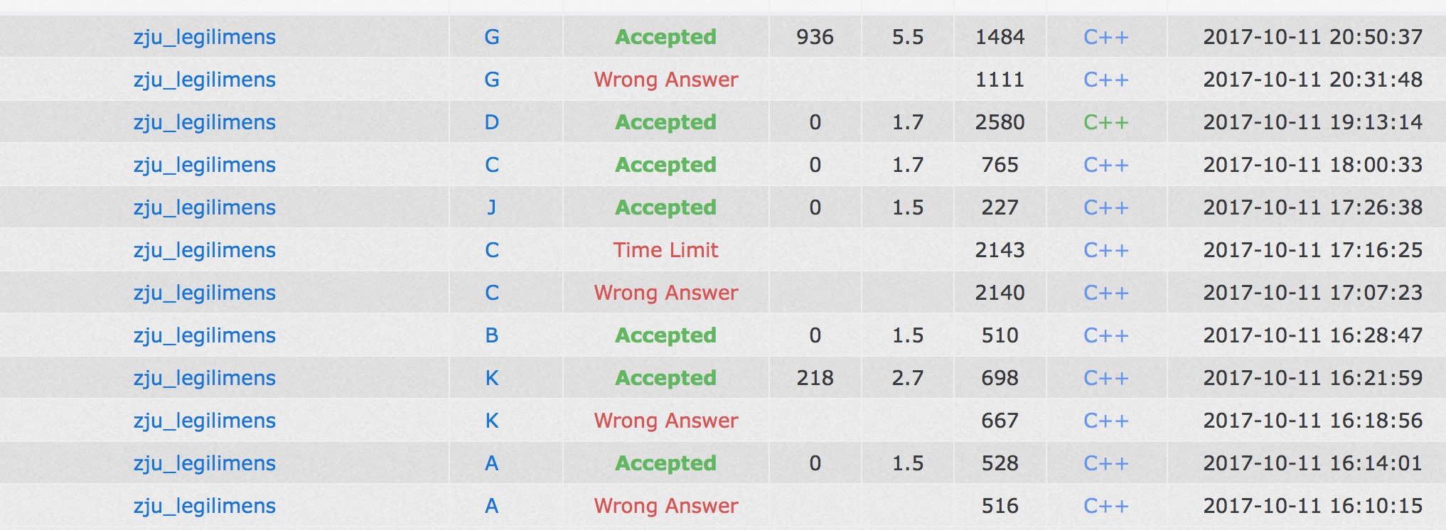 今天和三四队联合训练。开场各自看题,yzc认为A很签到,需要用java写,就打算让cjb翻译,后来讨论了一下后觉得用c++就好了不用大整数,就换下cjb,A1y14. sub让cjb去写K,cjb高速写完然后wa了,cjb打印调试,让yzc来写之前推了一下的B,cjb发现sub的题意有偏差,并不是欧几里得距离而是曼哈顿距离,修改后AC,K2y21. yzc不久后写完B,B1y28. 接下来的时候,cjb一个人在机上写博弈题C,sub和yzc在推J的公式。cjb觉得暴力能卡过去,然后就先wa再tle,只好打表找规律,打了出来之后发现很有规律,但是有四种情况,然后又觉得这个sg函数有一点奇怪,就和sub讨论了一下。yzc半推半猜搞了一个公式,上机敲了一发J,过了,J1y86. cjb调整了打表,打出了完全正确的表,三个人一起把四个规律写了出来,因为第四种规律恰好和前几天的16大连威佐夫博弈是一样的,所以就直接上了公式(实际上如果不知道就打表就好,因为只有1000种),C3y120. 接下来打算开D和G,D大家都想到了非常暴力的高斯消元,但是担心会tle,sub表示自己能搞一个能过的算法,就让sub一个人去单挑了。cjb和yzc把剩下的题都读完了,开了下H,讨论完之后发现题看错了...最后只得到G的前面那个小结论,别的题并没有什么进展。sub在三个小时的时候终于写完了D,最后D1y193. 最后三个人开心地吃起了晚饭,然后四队过了G,我们决定继续挣扎,最后sub和yzc强行讨论了一个dp,yzc上机写,wa了一发后就不断讨论不断打补丁,最后终于通过了此题,G2y290. 在原榜我们排在第6,然而之前训过的Siunaus也是7题,但是罚时比我们优秀,排到了rk4.