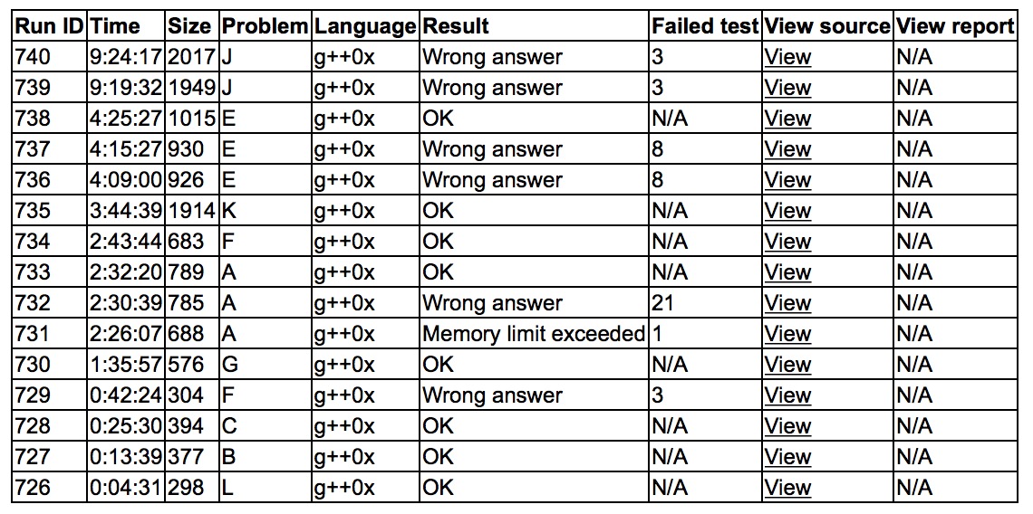 开场各自看题,看到有人过L,sub很快看了看,去写了一发过了,L1Y4. yzc看出B也是签到,B1y13. cjb和yzc讨论了一下C,yzc上机写C,C1y25. sub觉得自己想好了F,上机写F,获得wa,发现不太对。接下来cjb和yzc决定写A的暴力看看情况,写完后发现样例过不了,觉得题意有点偏差,就先放着了。两人期间尝试开G不太会,sub过来帮忙想G,很快想到了,sub上机,G1y95. 后来终于明白了A正确题意,yzc改了改爆搜,发现依然跑很快,决定打个表看看所有情况的大小。sub想好了F,上机写F,写完后发现跑大数据会爆栈,决定改手写栈。此时表打完,感觉爆搜很稳,yzc交了一发获得MLE,cjb给出了dfs两遍的建议,yzc修改后wa 21,cjb发现yzc数组开小了,修改后AC,A3y152. sub继续写F,随后F1Y163. sub继续写K,cjb和yzc努力做E,sub写完后yzc出了点数据,帮sub修改了点细节,提交后通过,K1y224. 随后三人一起讨论E,yzc在sub提示下想到倒推,上机写E,wa了两发后打了几个补丁获得通过,E3y265. 最后sub写J,未能做出来。eternal reality和siunaus都是10题,我们只有8题,虽然比Tazof和dominoes好一点点但并没有区别,提高的地方还很多啊。