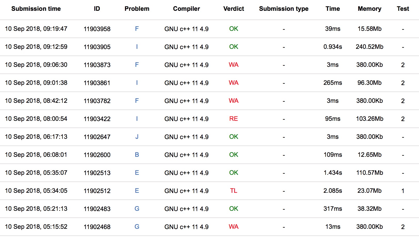 出门各自看题,三个人很快开出了E和G,'''G2y31''','''E2y44''',之后cjb大力猜了B的结论,'''B1y77''',sub上机写J,'''J1y87''',之后三人开F和I,sub上机写F,cjb上机写树hash之后yzc上机写I,wa了之后和cjb一起查错,最后发现hash要long long,'''I3y262''',sub '''F3y269''',6题罚时893。