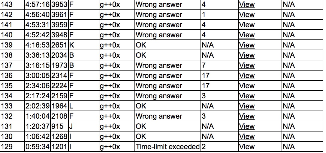 出门各自看题,sub以为自己会C,上机摸了一会儿走远了,之后sub上机写I,I2y66,cjb上机抄SAM,yzc J1y80,cjb试图搞F, wa了,叉了算法,改帮yzc写L,L1y122,之后cjb在机上疯狂艹F,wa了一万发,之后yzc上机写B,wa了之后对拍B2y216,cjb上机写点分治,sub上机补二分,K1y256,之后cjb和yzc刚F,wa了一年,赛后发现cjb参数反了,才过。